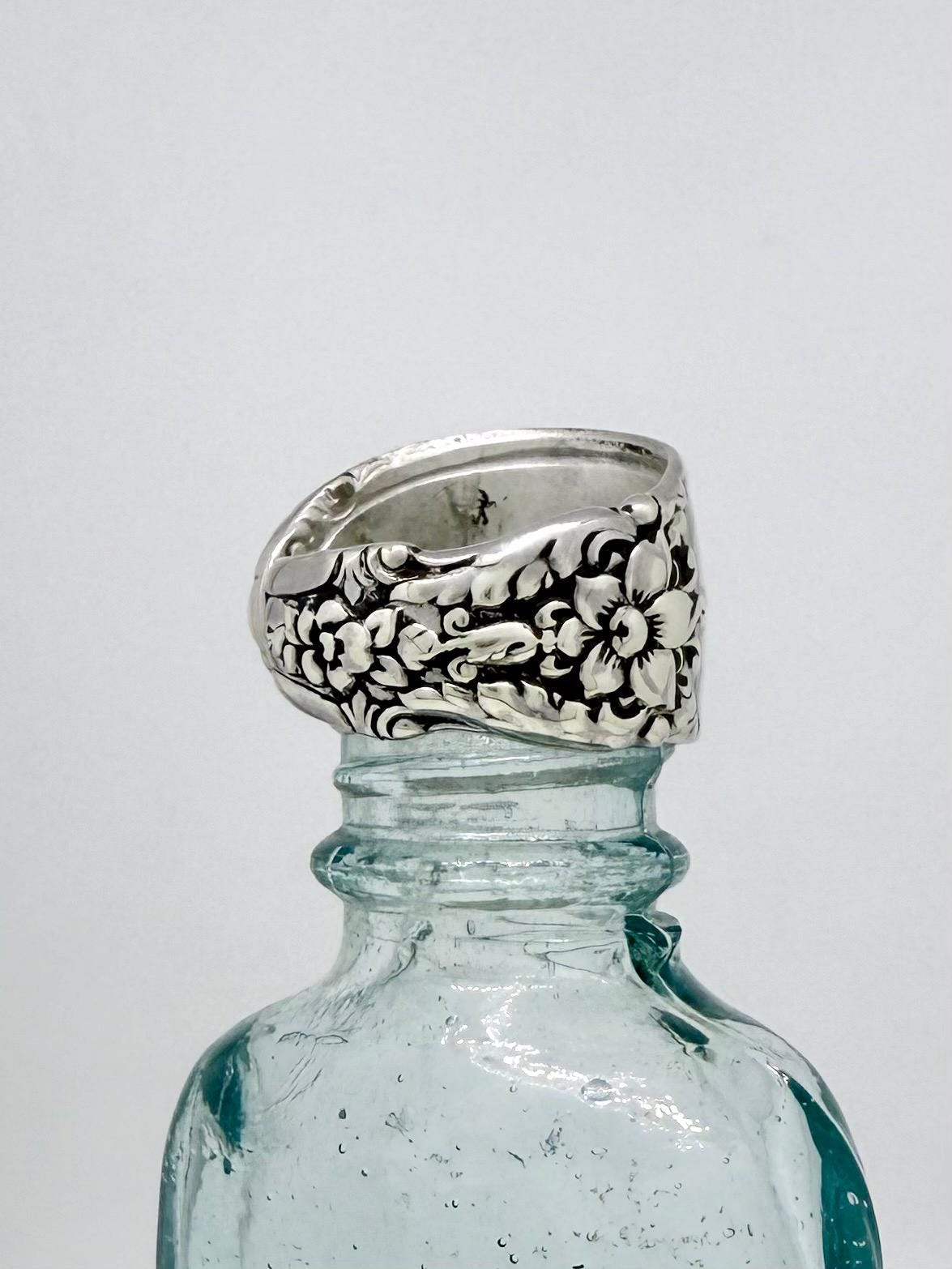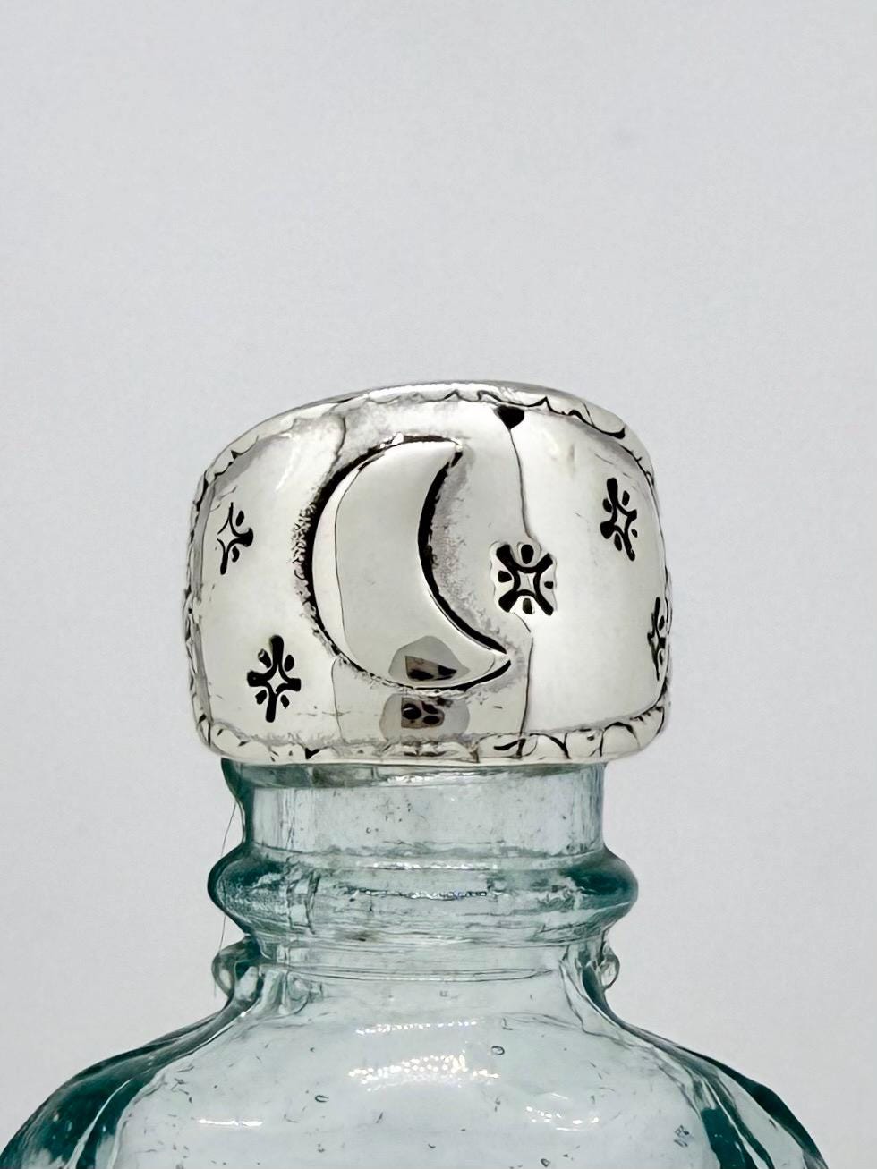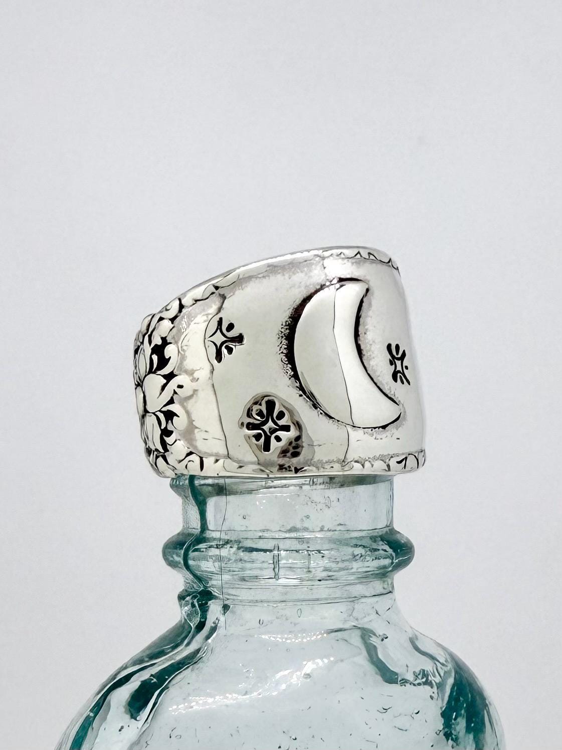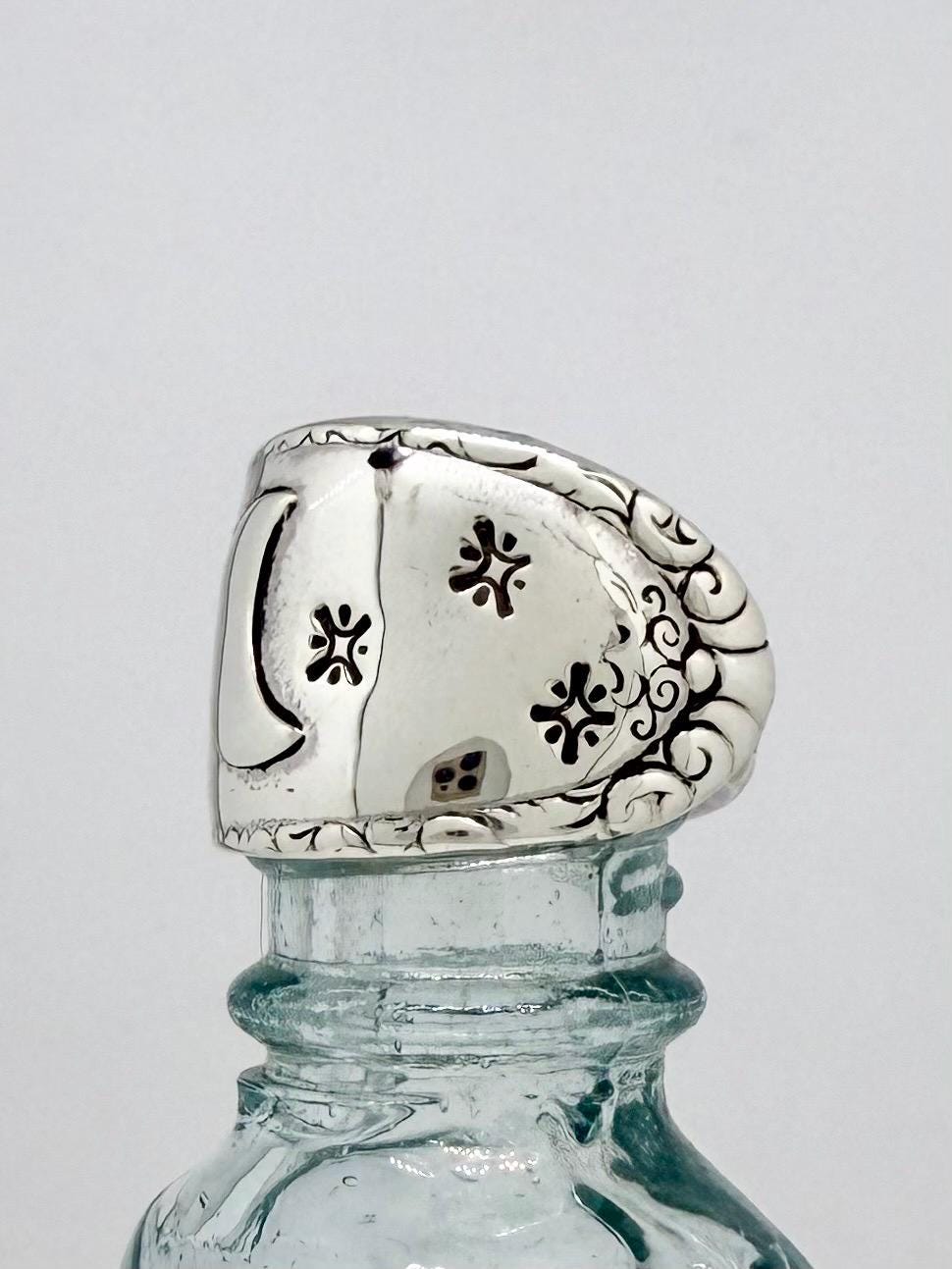 This is a spoon ring made from Solid Towle Sterling, Silver Spoon. The pattern is called "Old Mirror" and is from 1940. There is a moon and stars added to it.the ring is size 6.Marked STERLING inside.