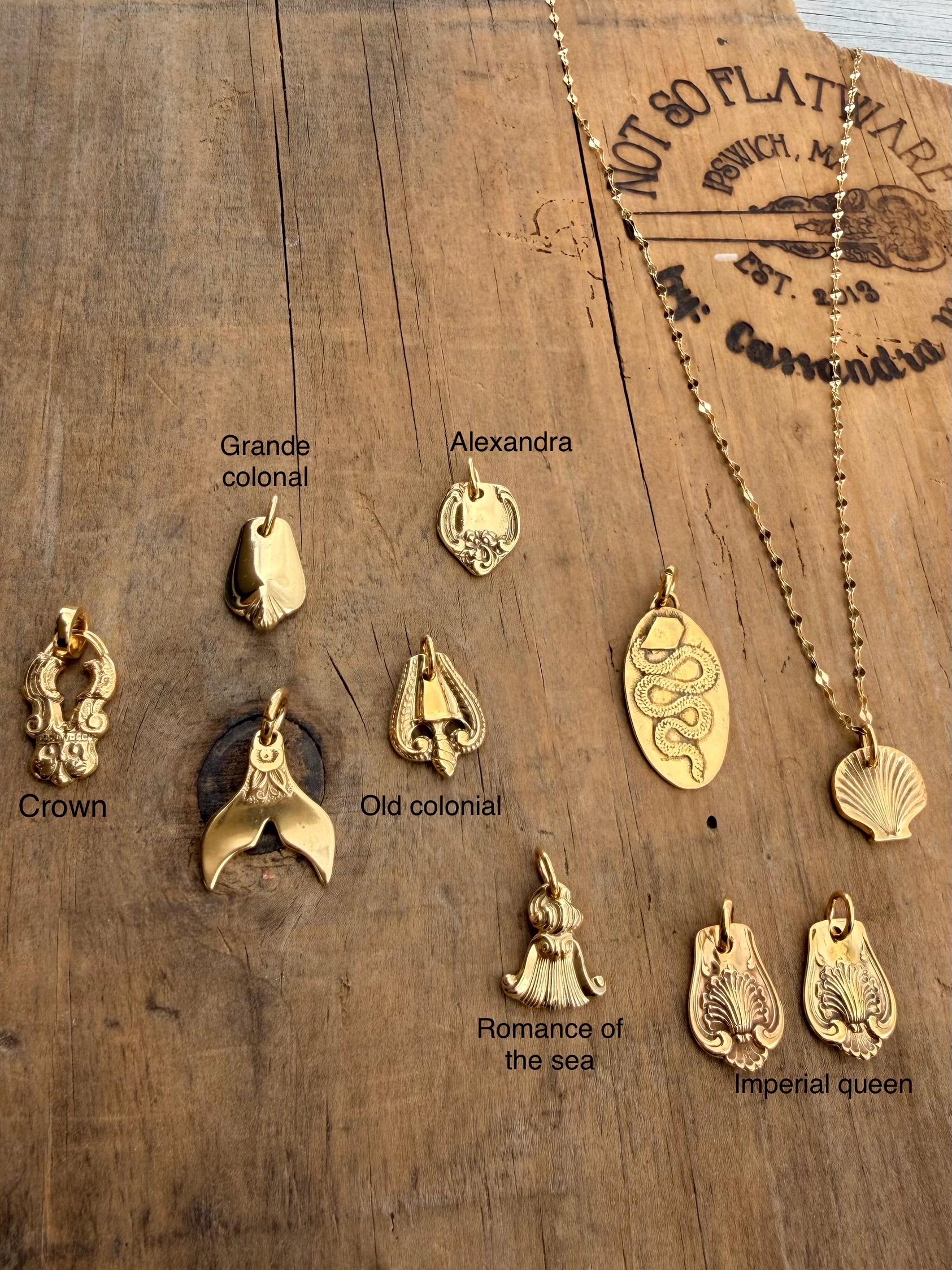 This unique necklace charm is handcrafted from the handle of a vintage sterling silver spoon, lovingly repurposed into wearable art. The handle retains its original ornate detailing — delicate scrollwork, floral motifs, and graceful curves that reflect the elegance of classic silverware design.