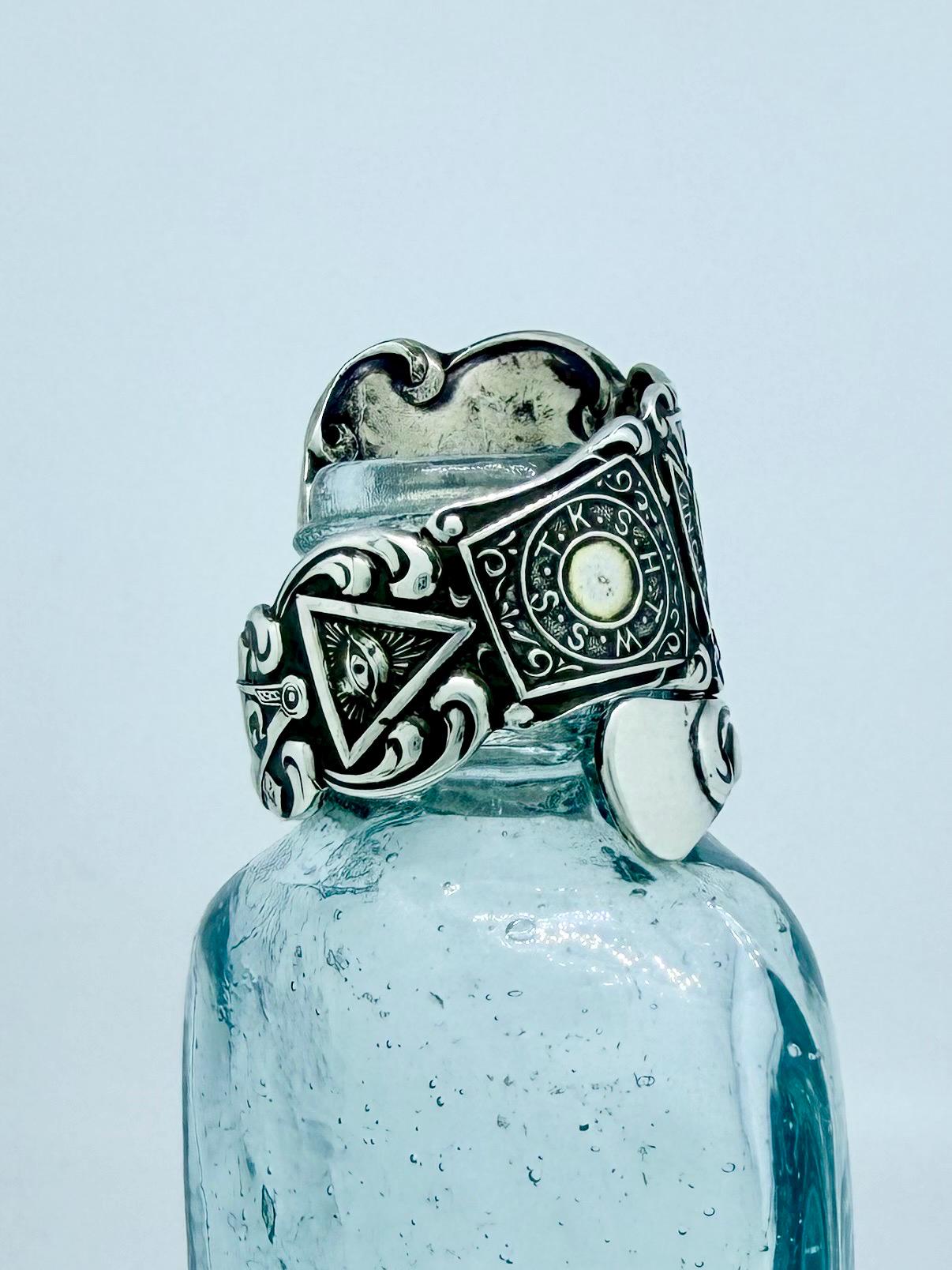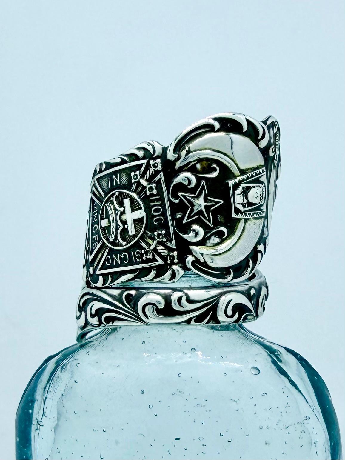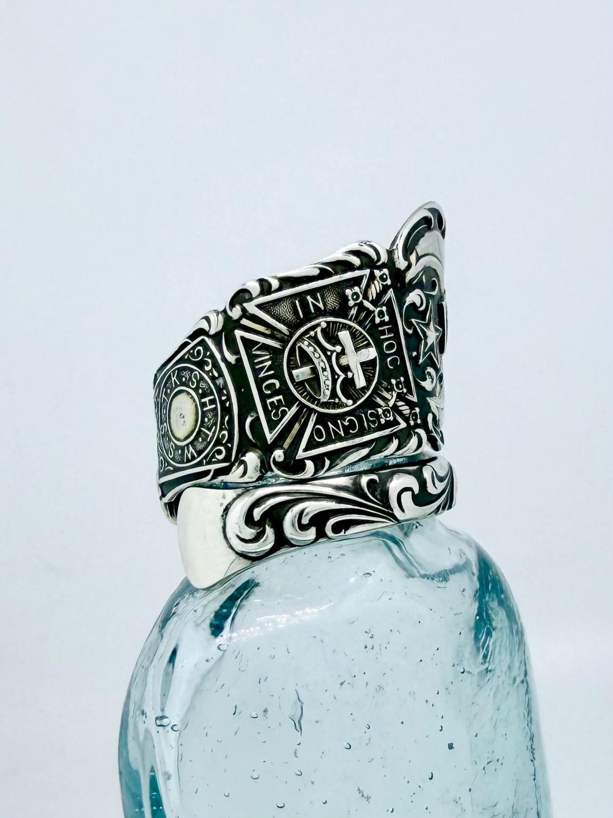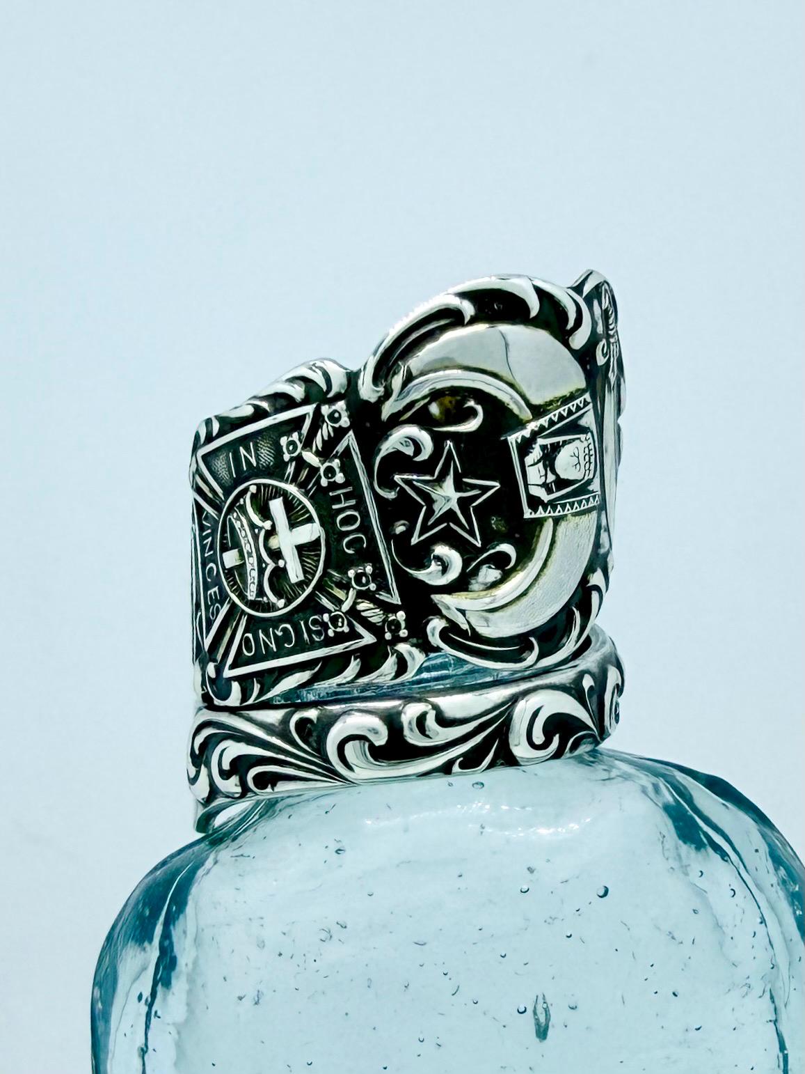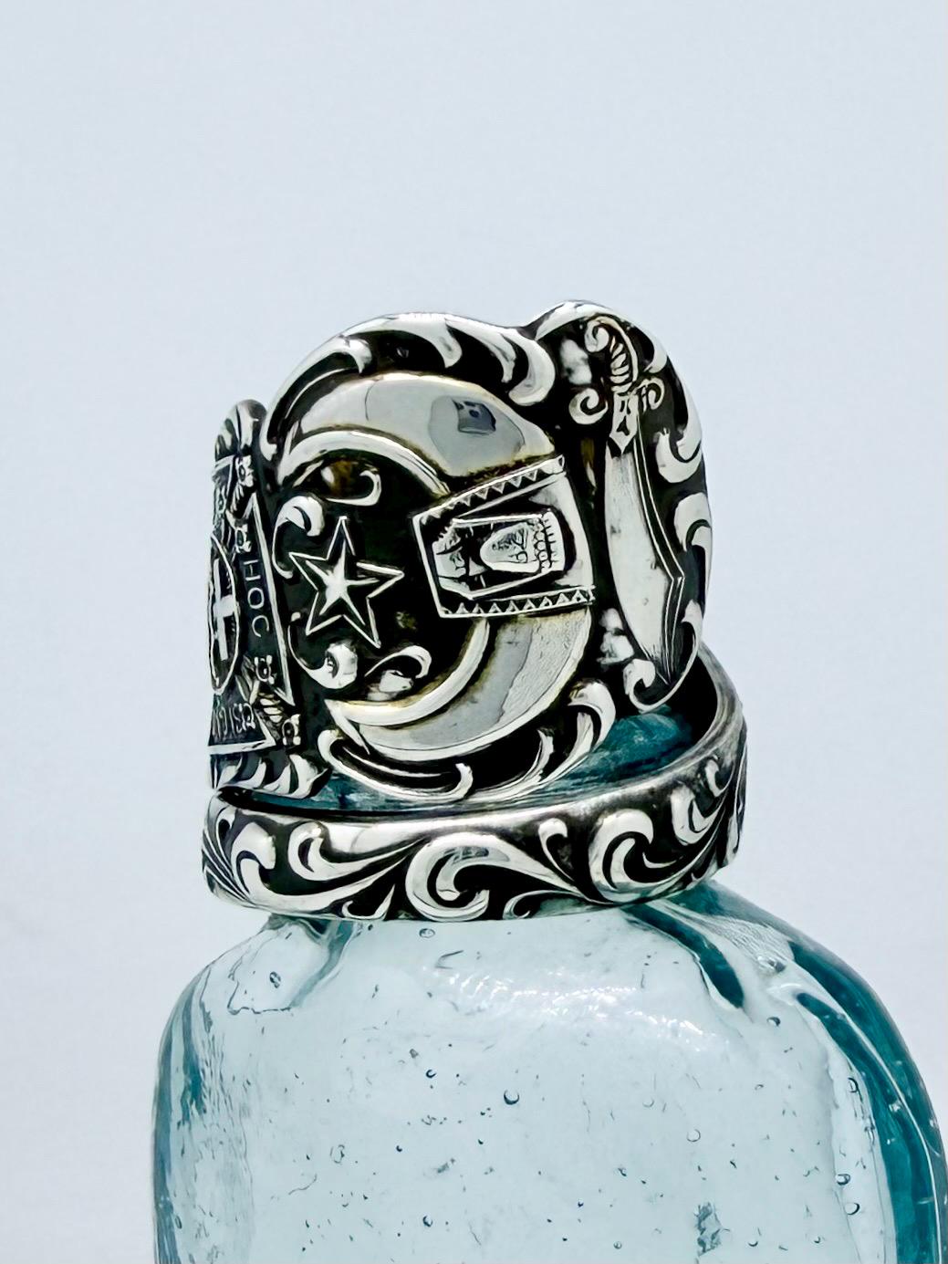 This ring was made from a Sterling silver spoon. The pattern is of all different symbols for freemasonry.