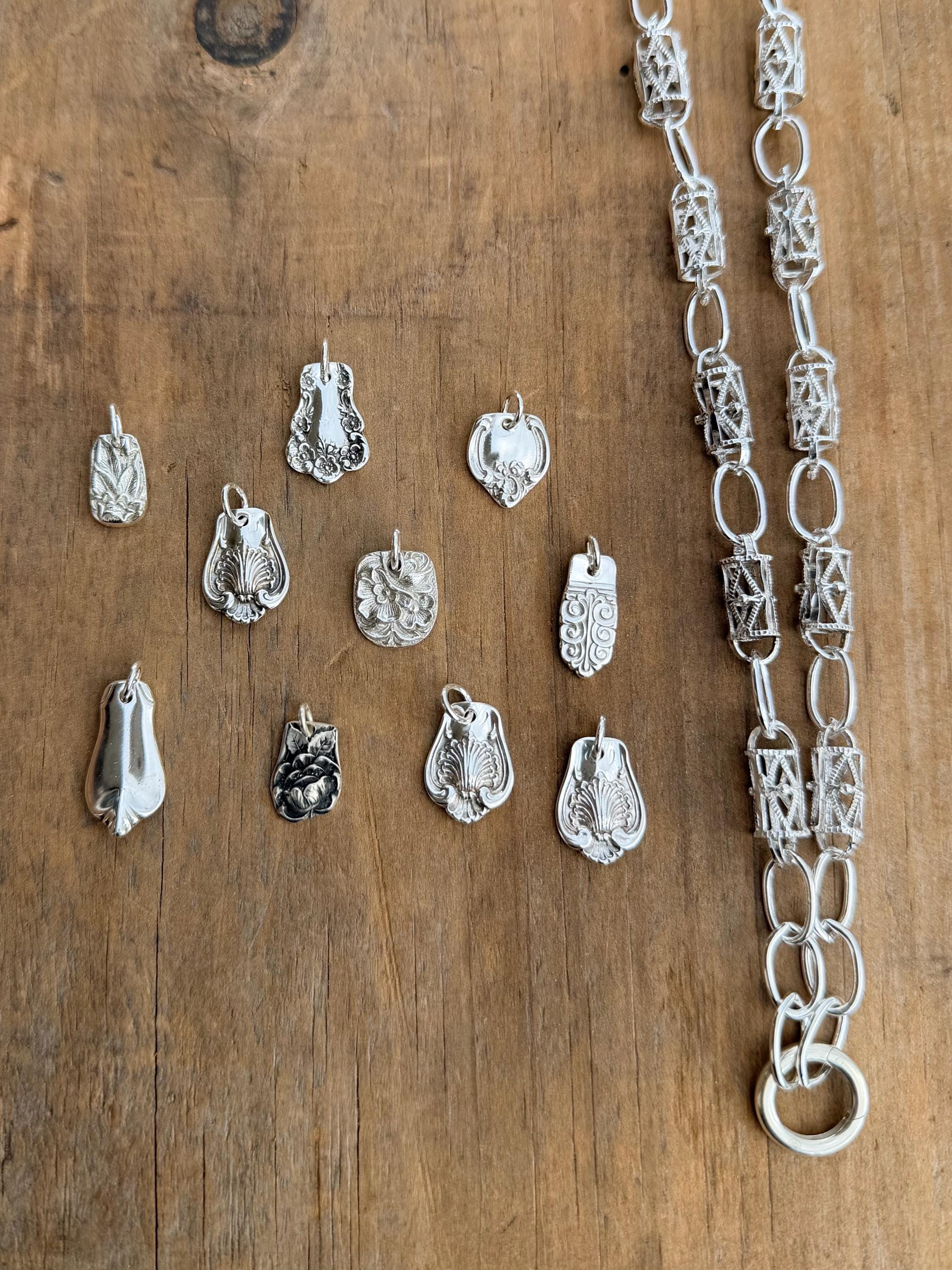 This unique necklace charm is handcrafted from the handle of a vintage sterling silver spoon, lovingly repurposed into wearable art. The handle retains its original ornate detailing — delicate scrollwork, floral motifs, and graceful curves that reflect the elegance of classic silverware design.