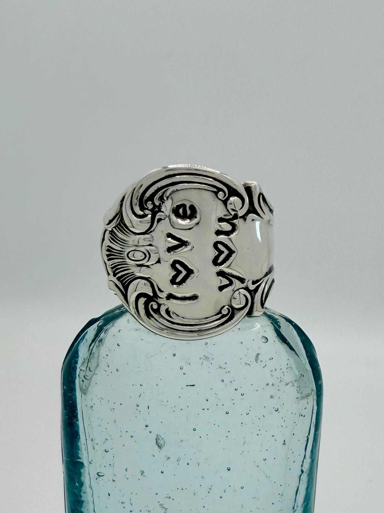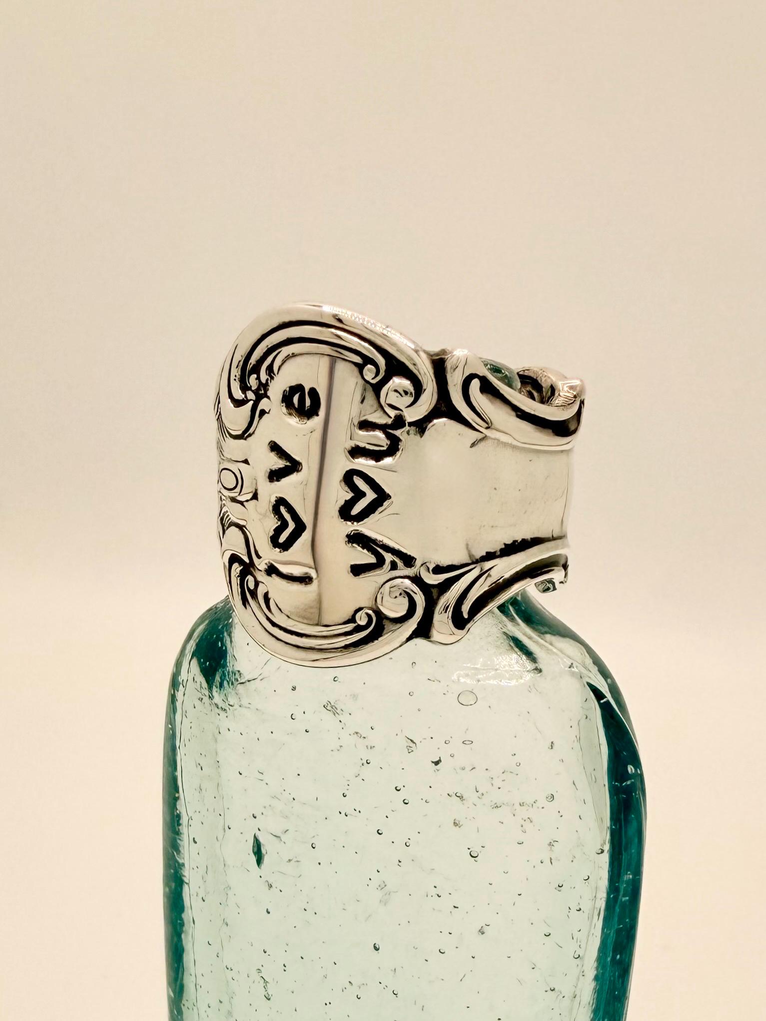This is a spoon ring made from Solid Sterling Silver Spoon. Each letter has been hand Stamped, Oxidized(only in the stamped ares to make them black), and High polished for a EXTREME Mirror Finish Shine.