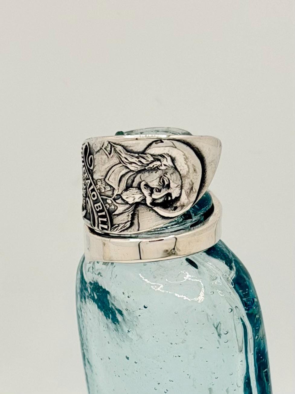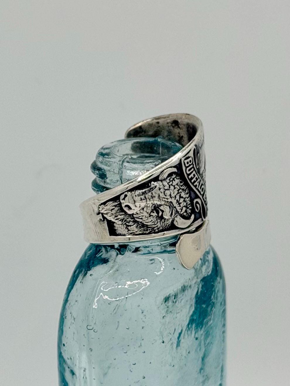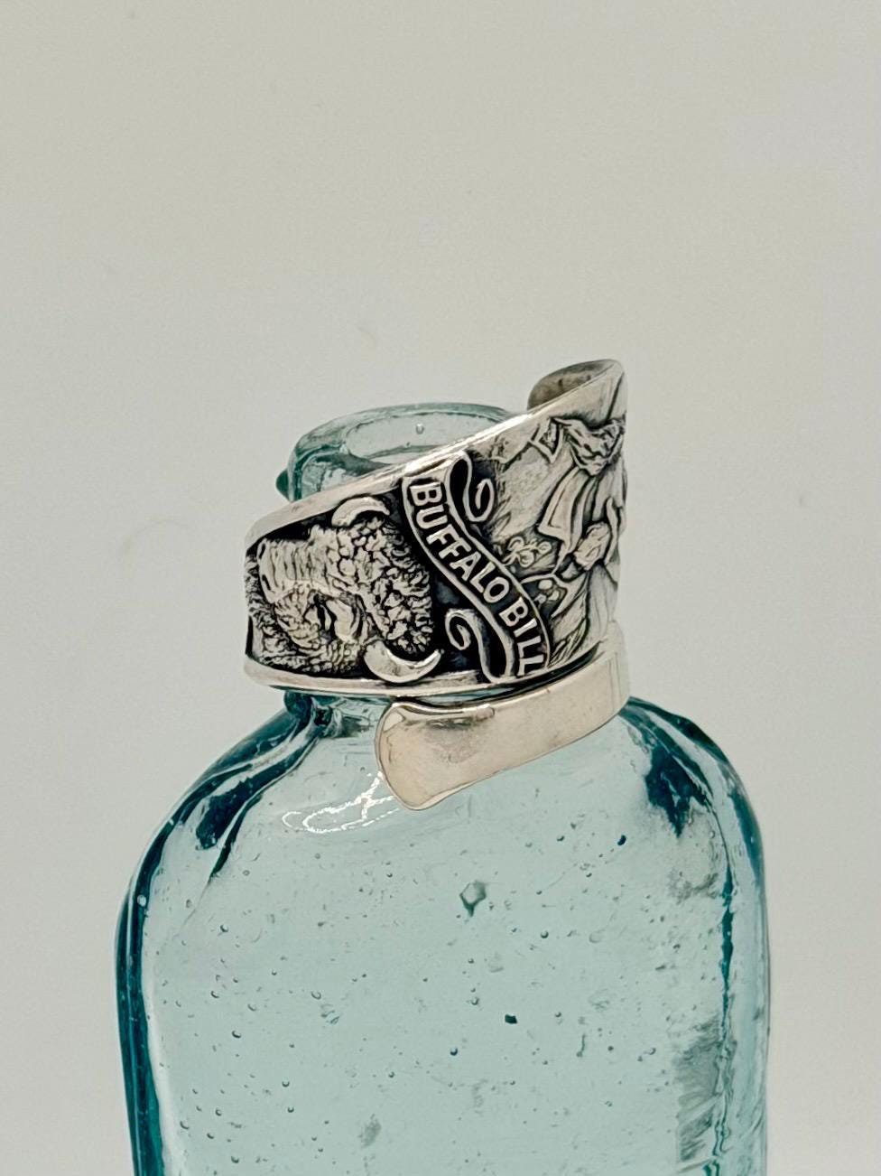 This is a spoon ring made from a Sterling silver souvenir spoon. The pattern is of Buffalo Bill, with a buffalo head under him..