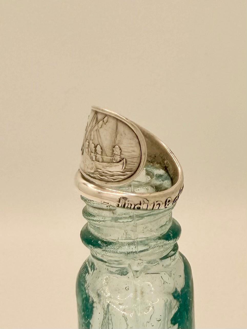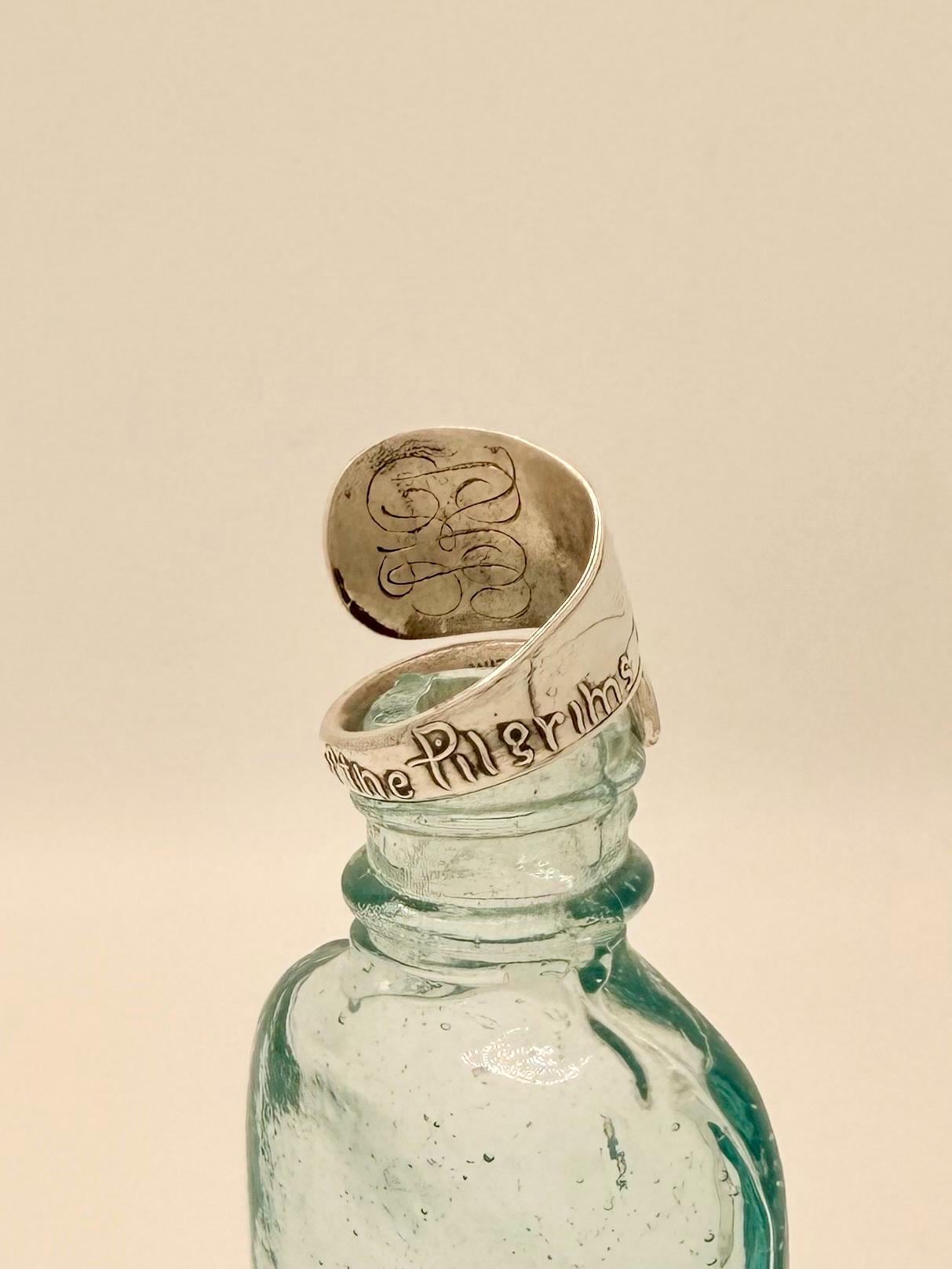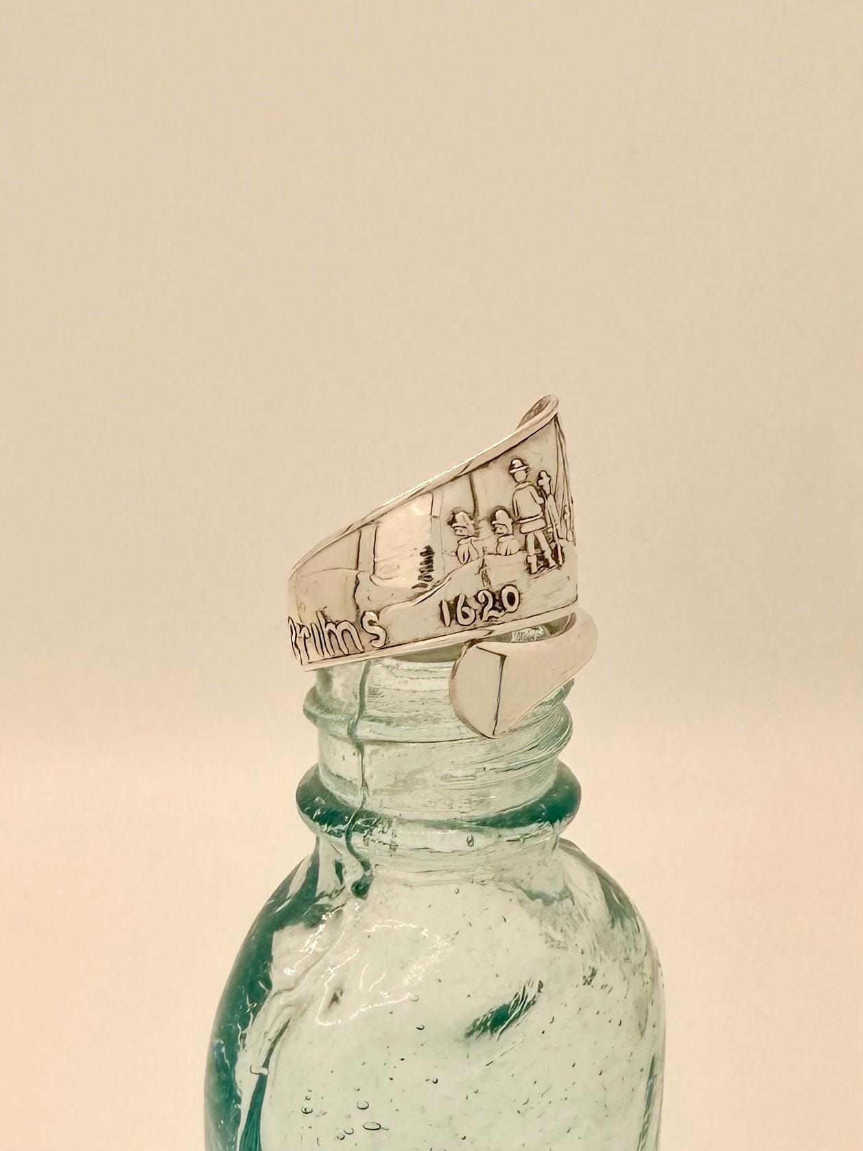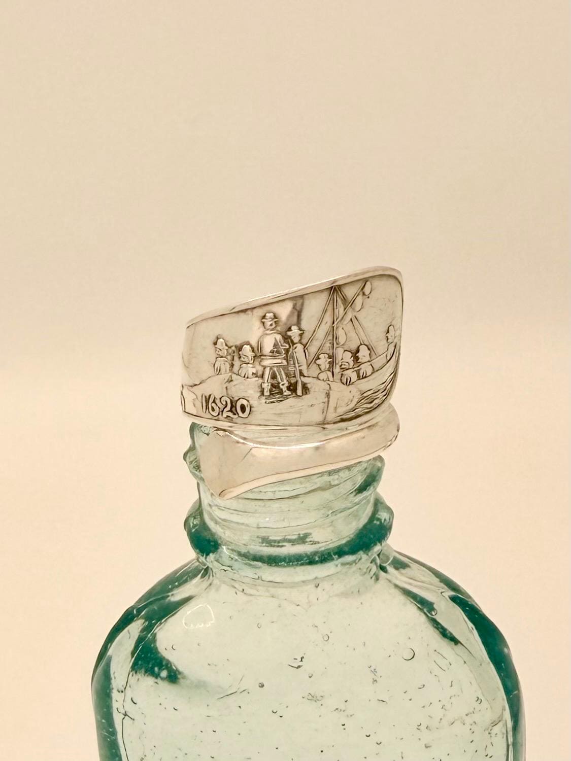 This is a spoon ring made from a Sterling silver spoon. The pattern is of the 'Landing of the Pilgrim's" which is written on the ring, as well as 1620.