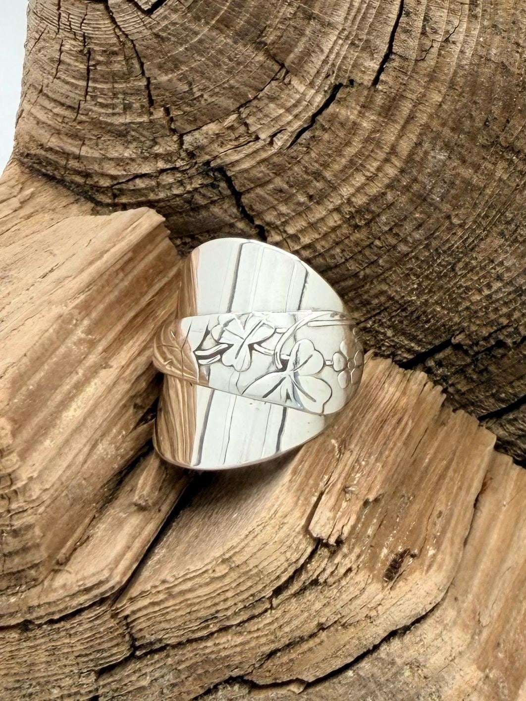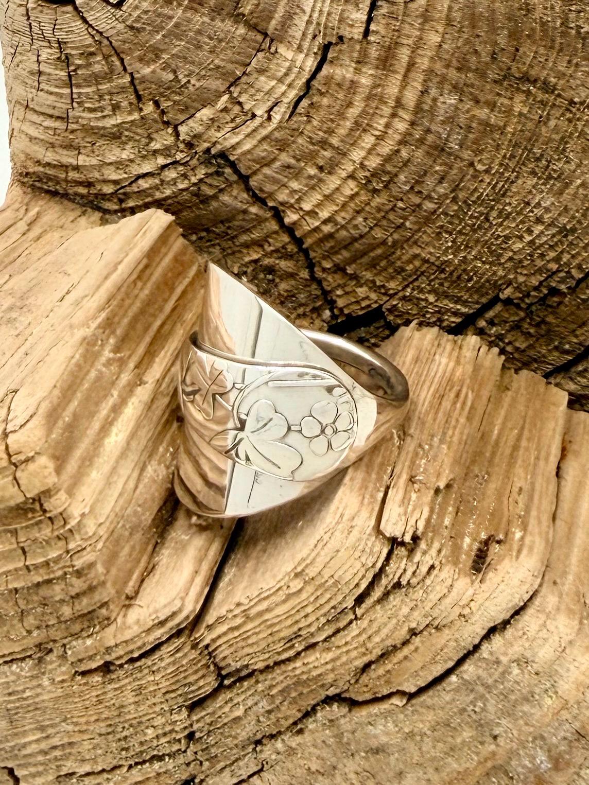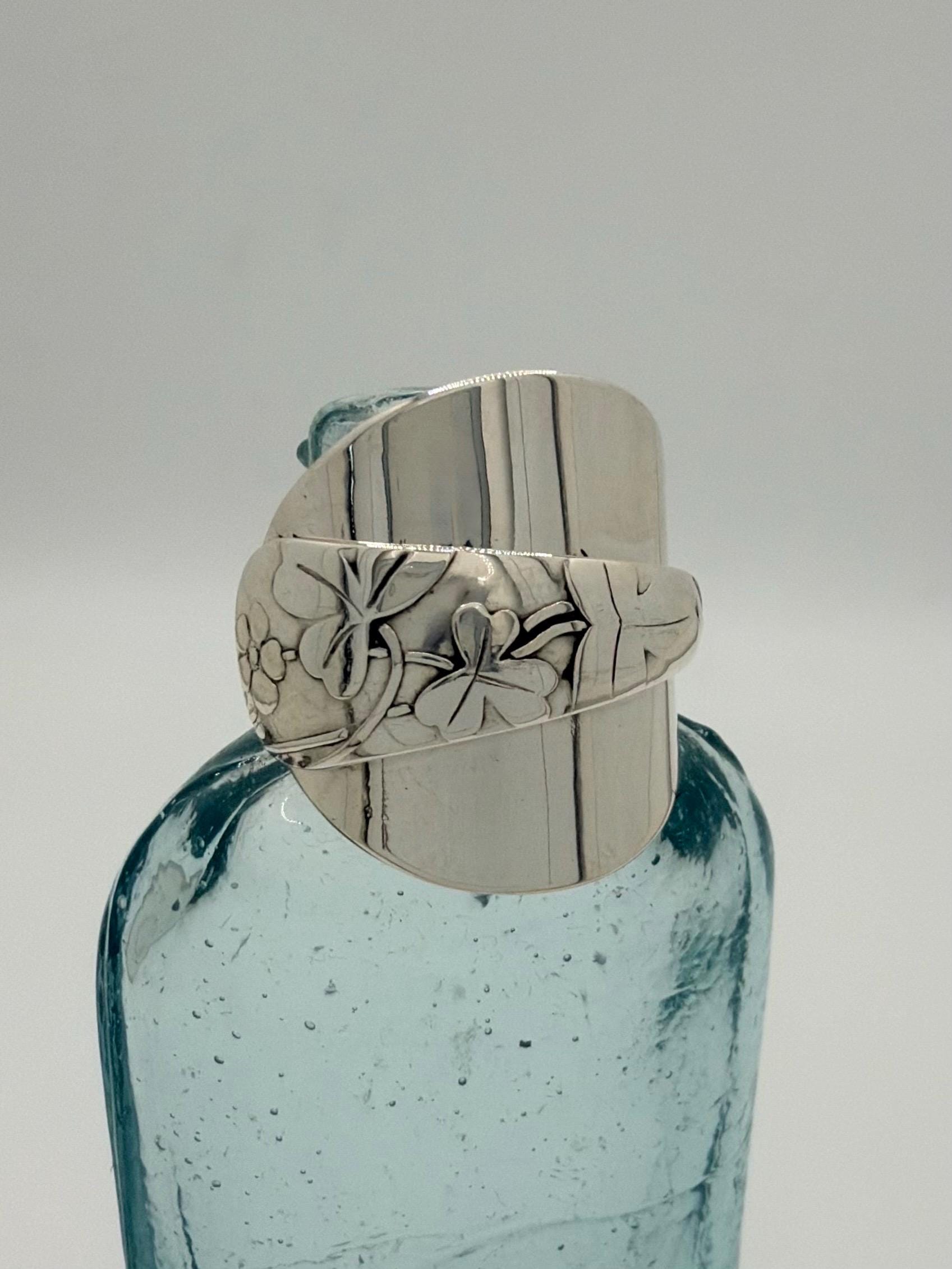 This is a spoon ring made from a sterling silver spoon. the pattern is of clovers wrapped over the spoon bowl.