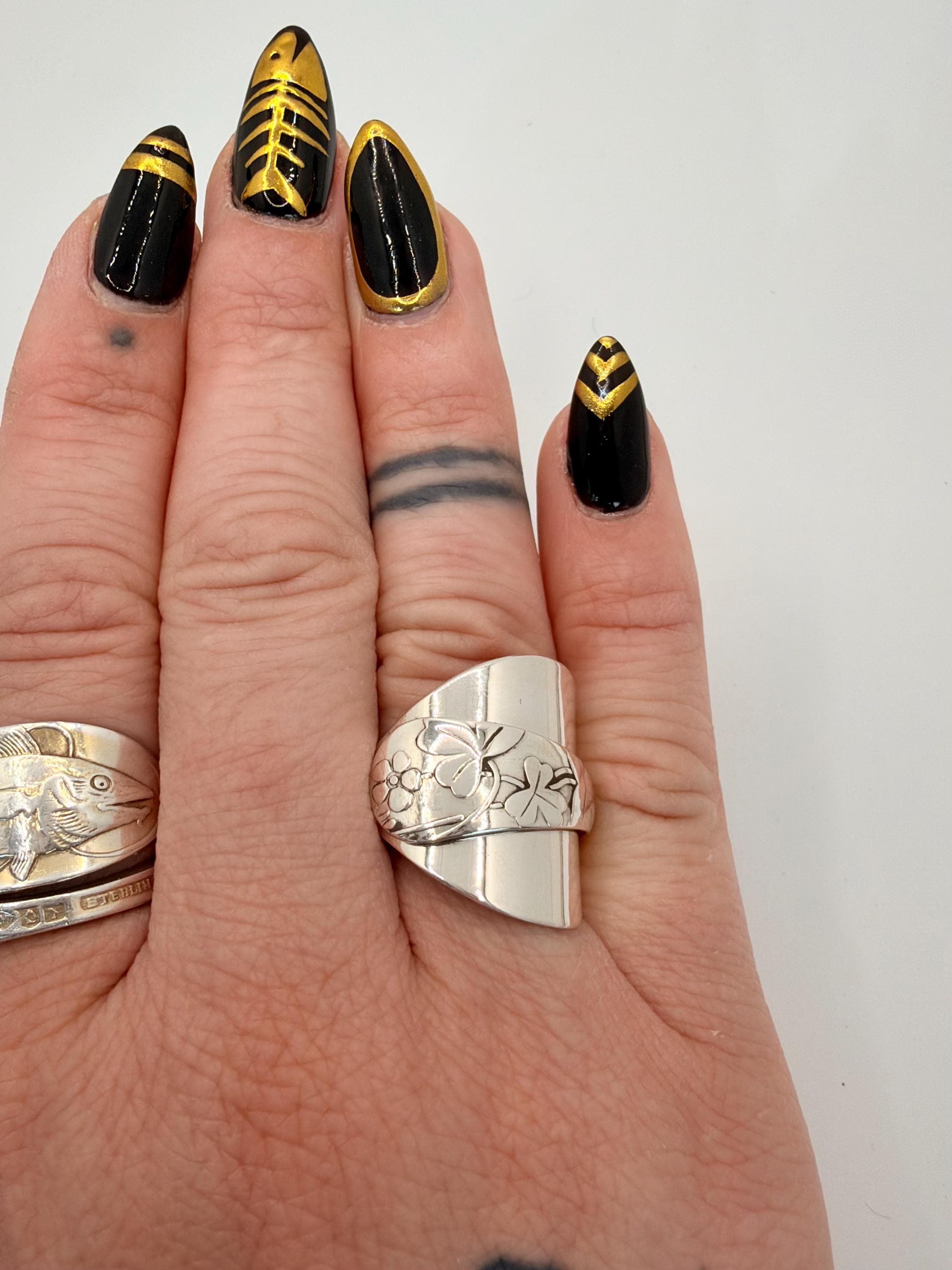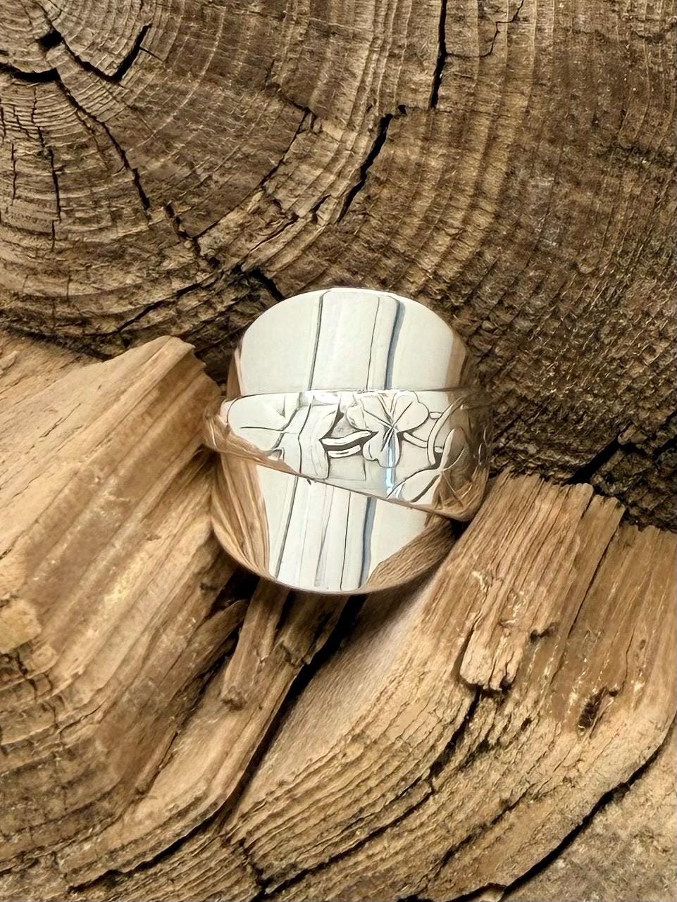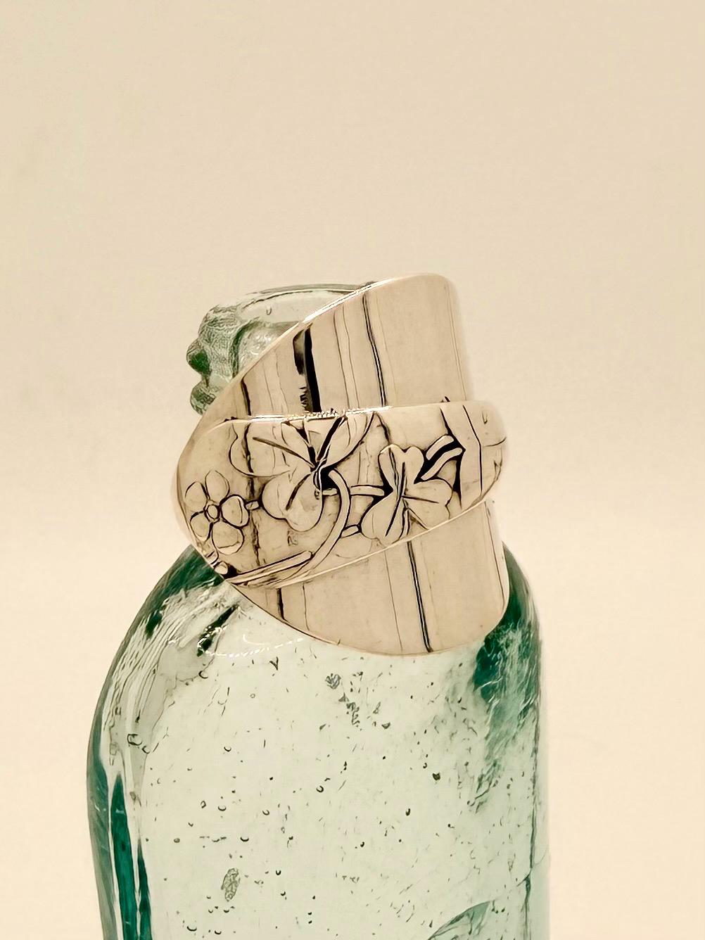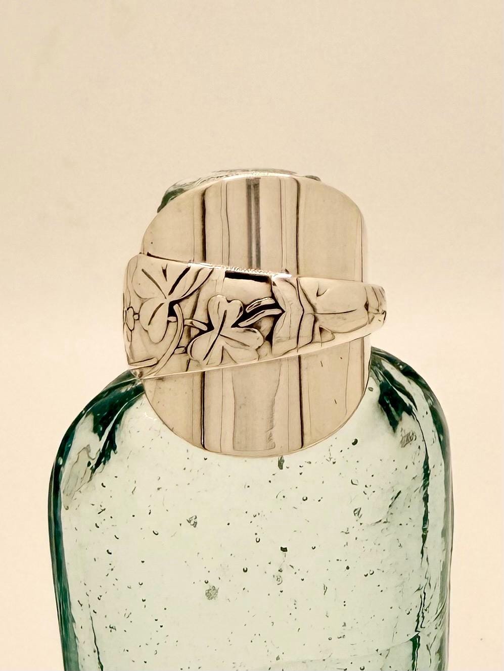 This is a spoon ring made from a sterling silver spoon. the pattern is of clovers wrapped over the spoon bowl.