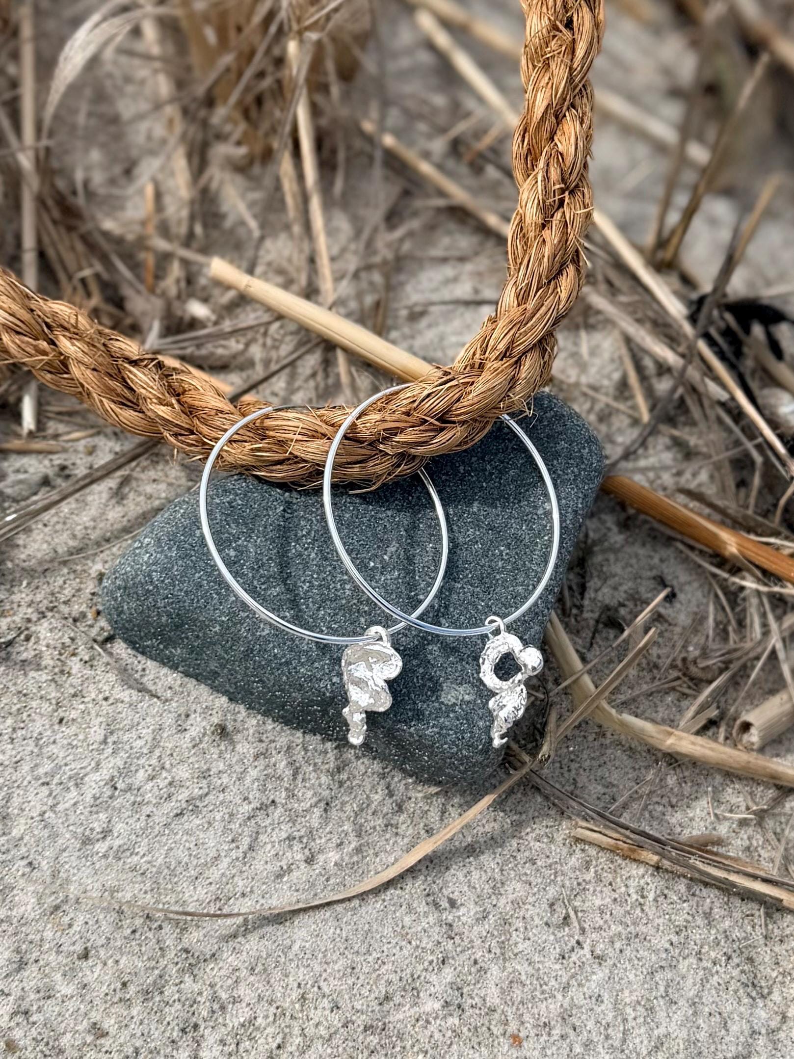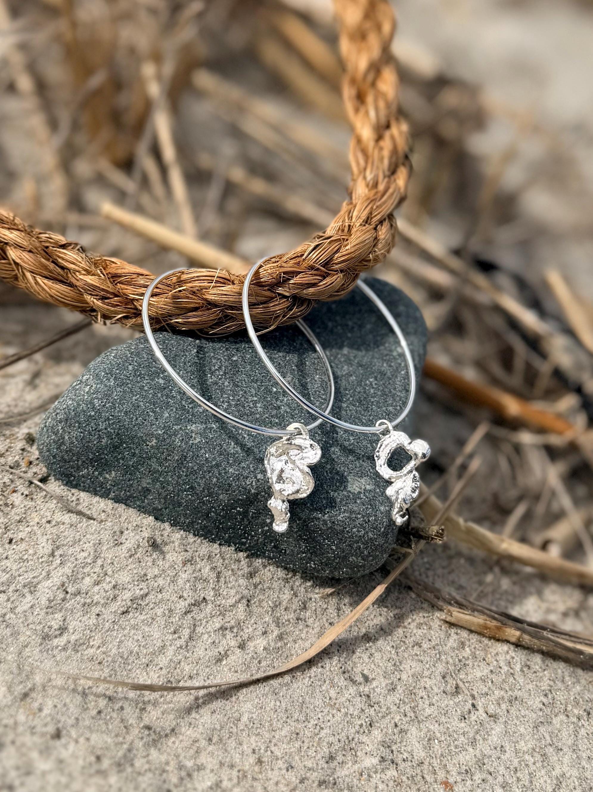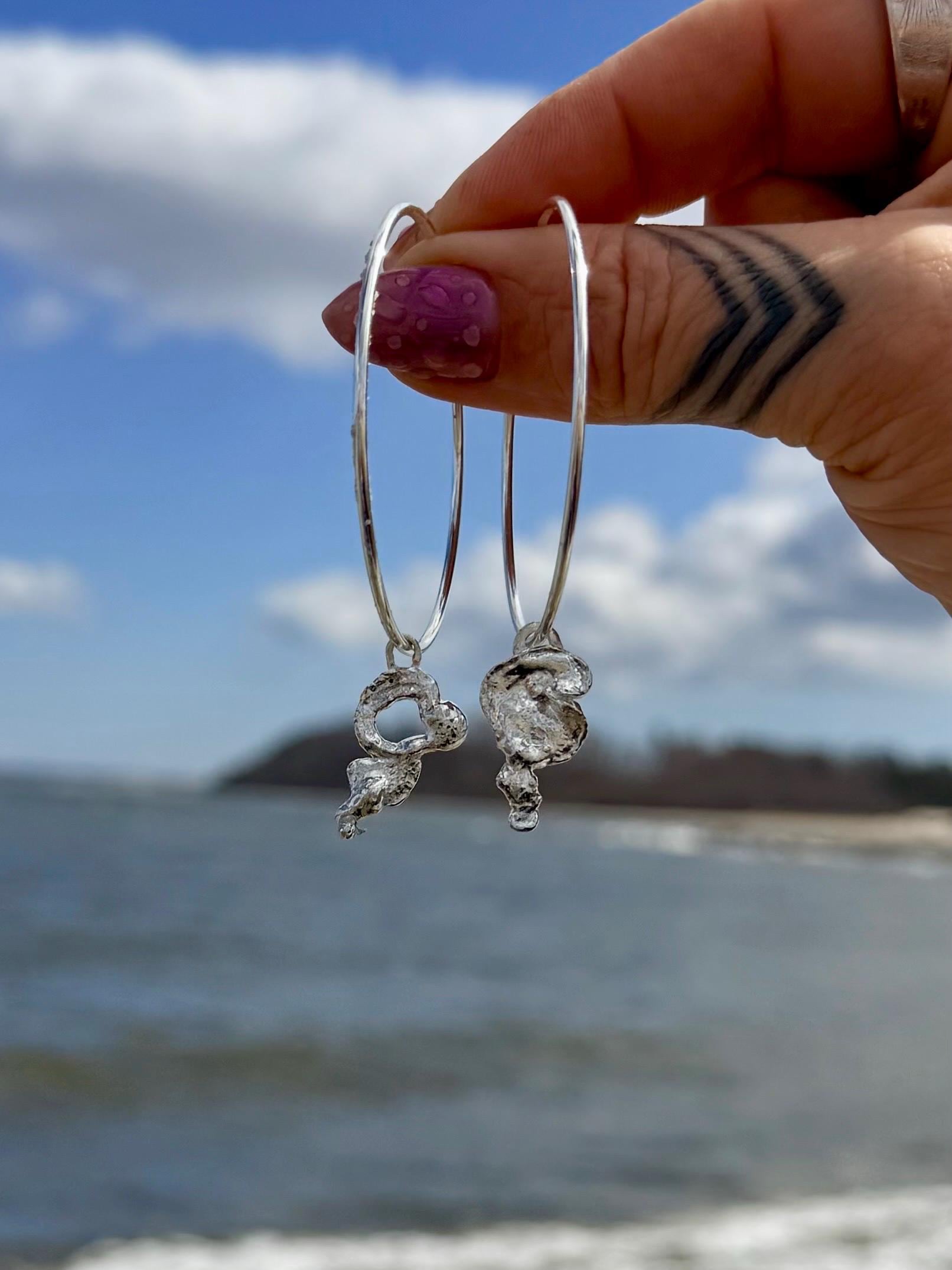 Sterling Silver Hoop Earrings with Ocean-Kissed Sterling Silver Drip Charm – Handmade from Melted Sterling Silver by the Sea