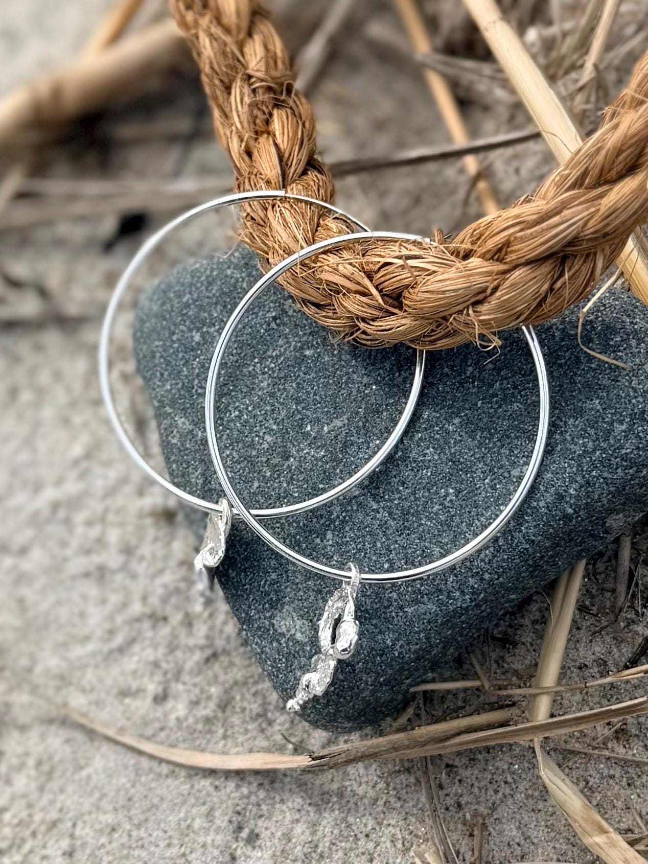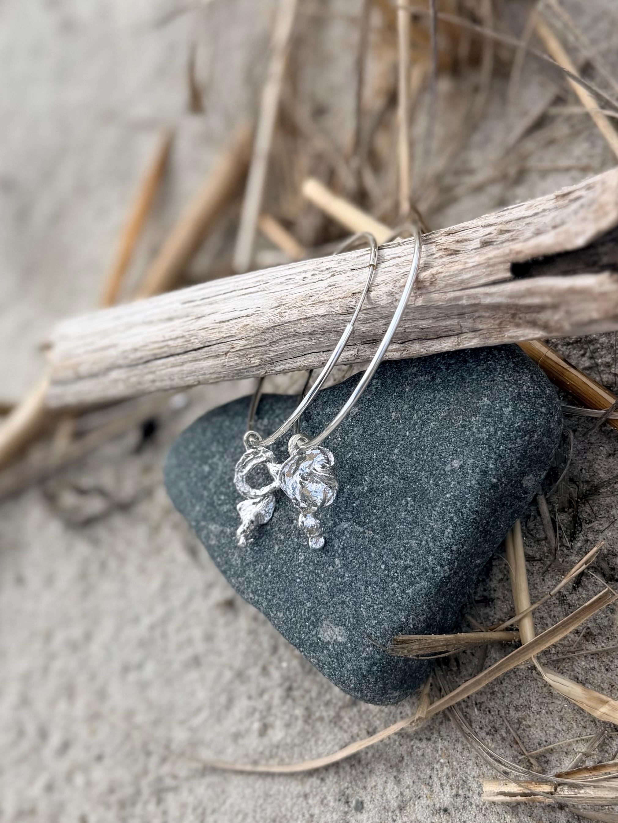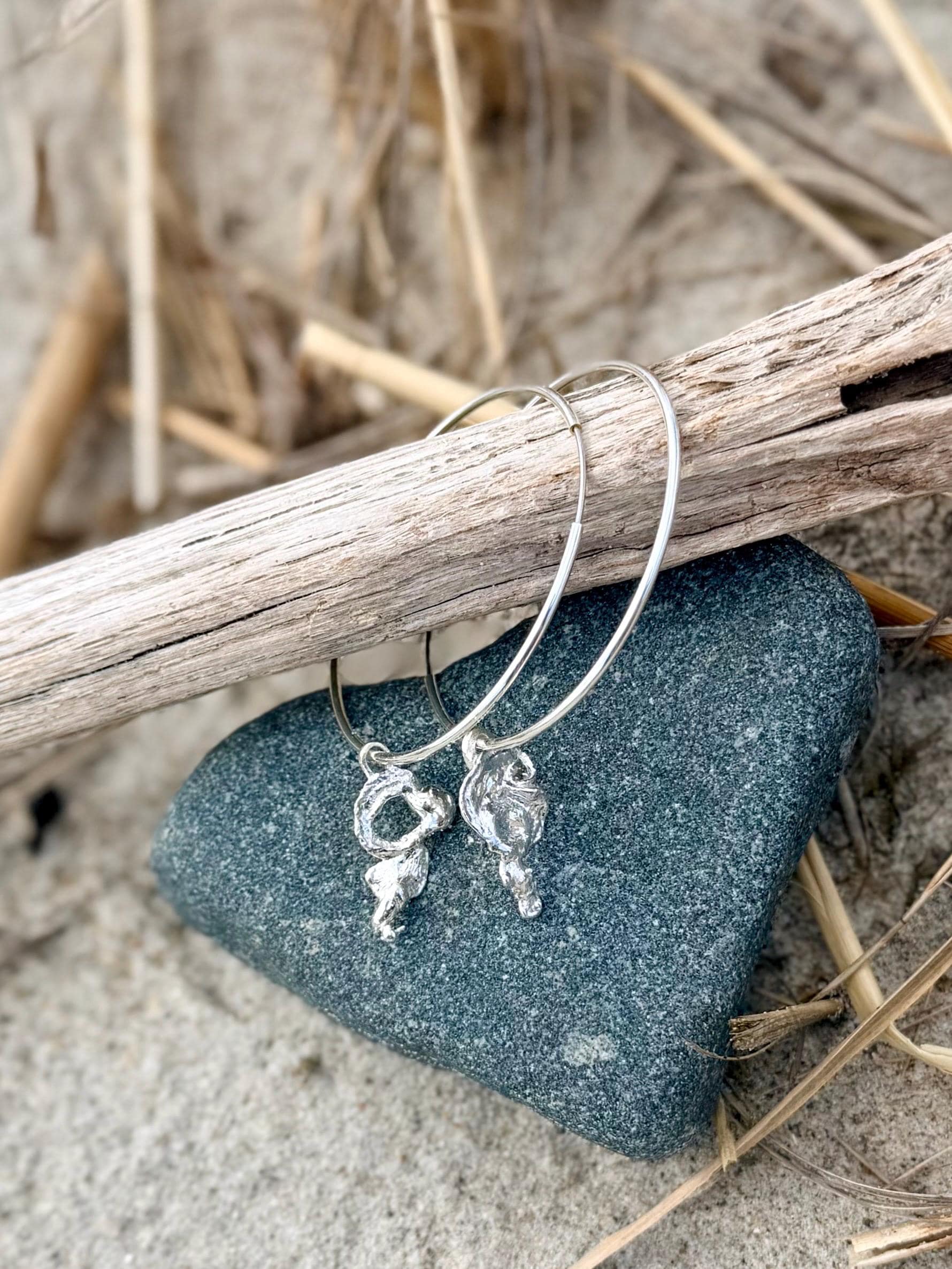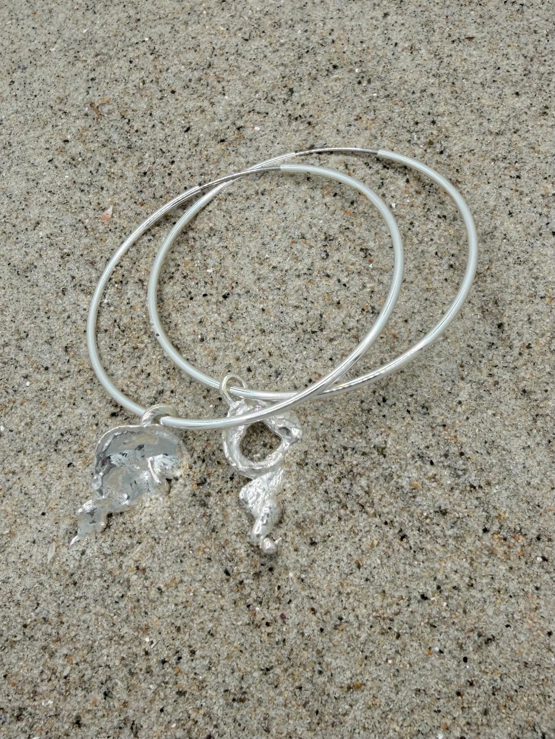 Sterling Silver Hoop Earrings with Ocean-Kissed Sterling Silver Drip Charm – Handmade from Melted Sterling Silver by the Sea
