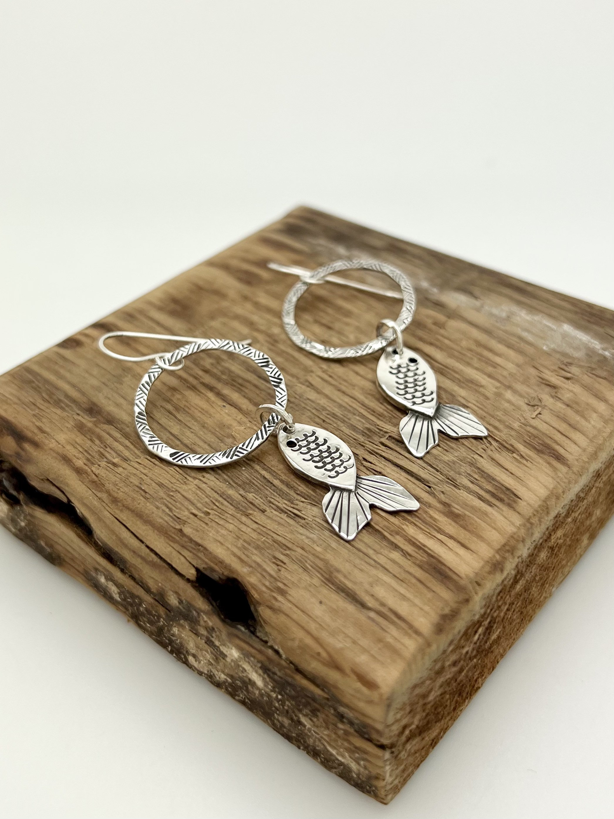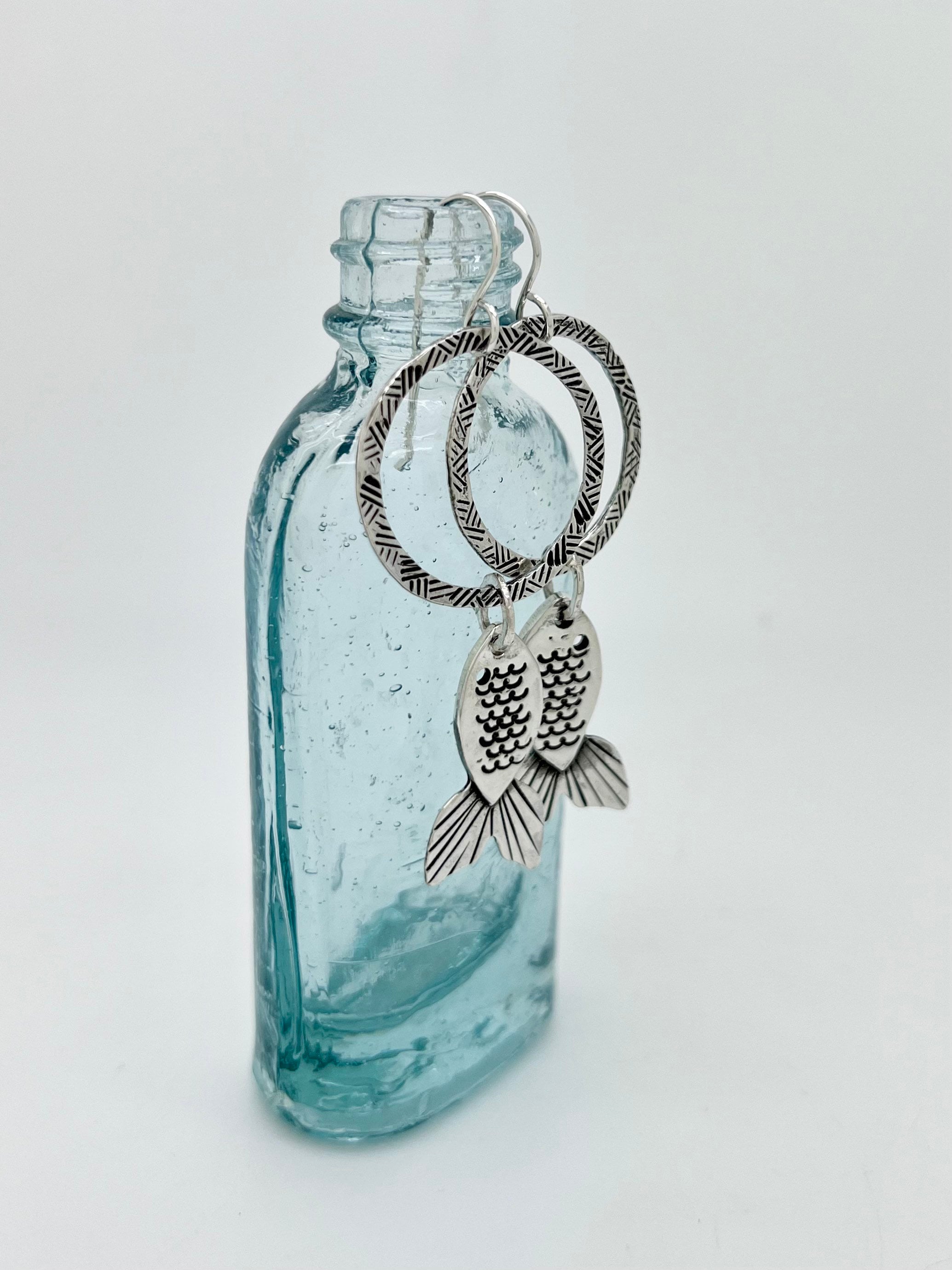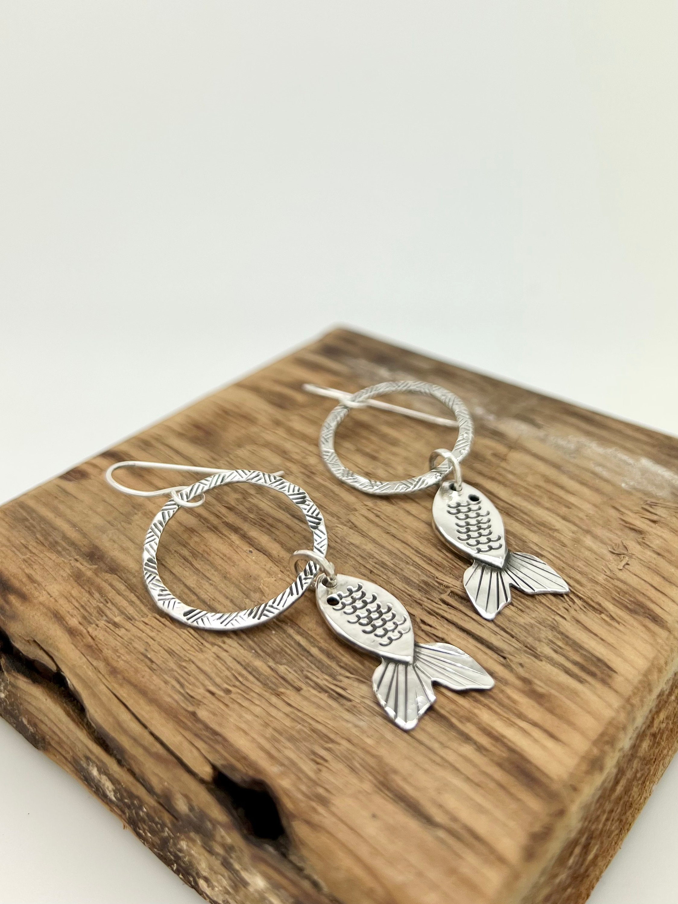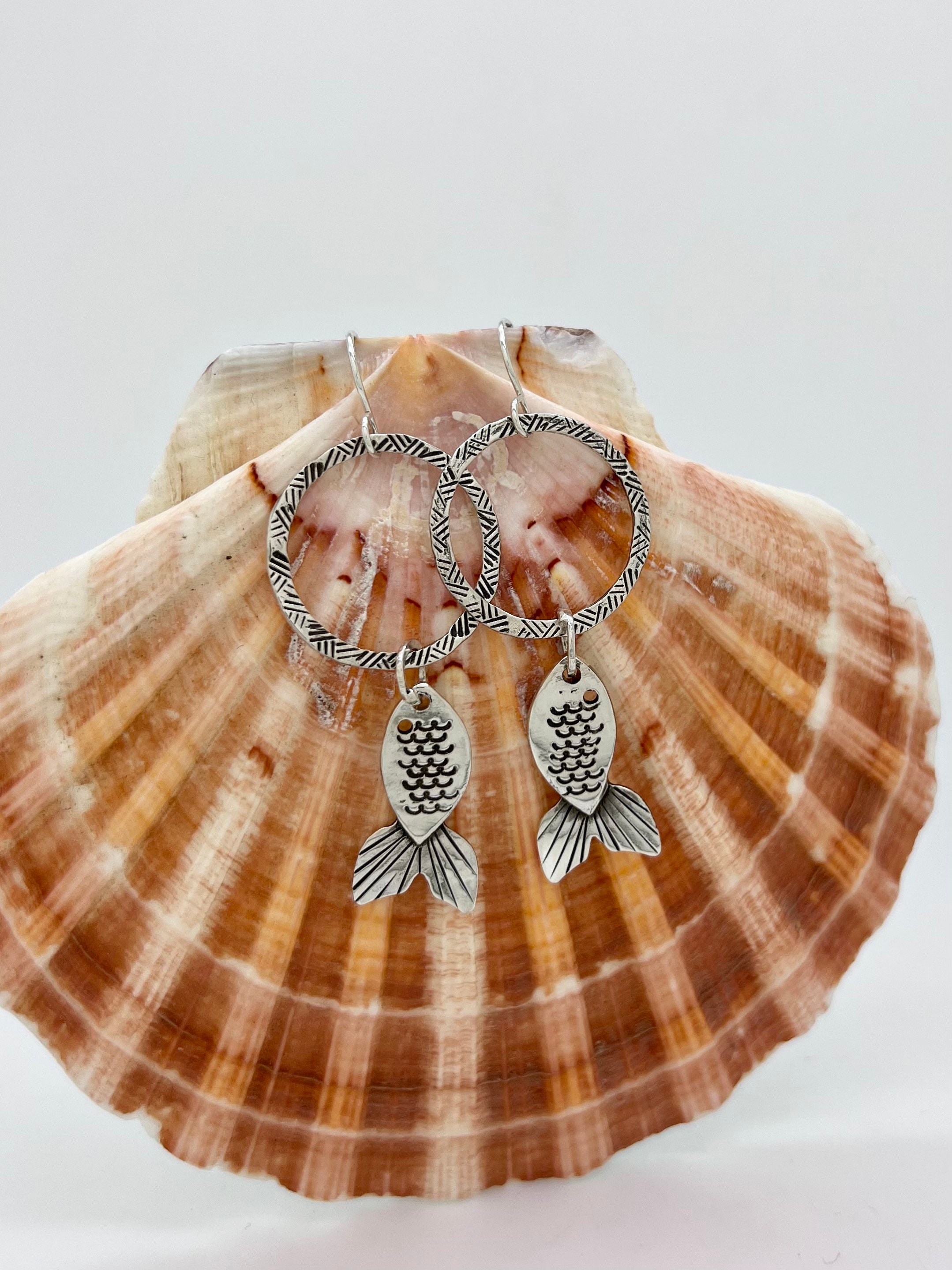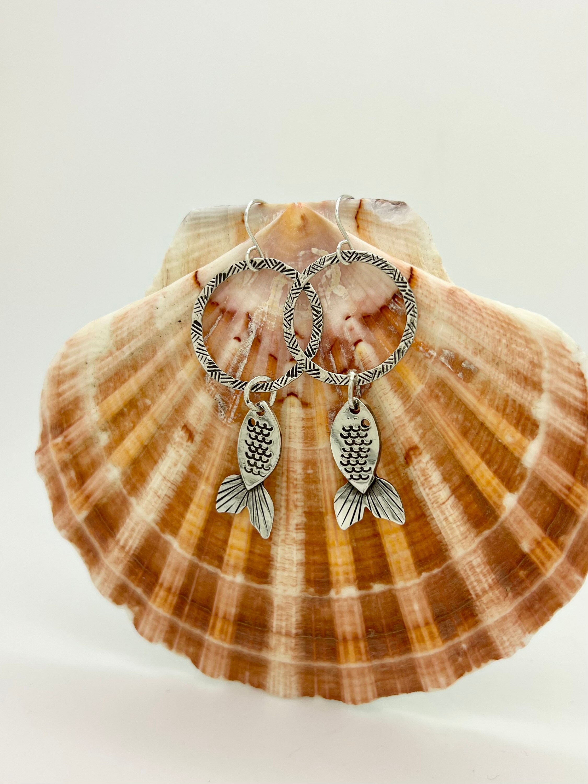 These are beautiful Hand crafted,Sterling Silver Hoop Earrings with a handmade fish drop charm. The charms were made from Vintage sterling silver spoon pieces. The fish patterns have a matching bangle bracelet available as well. https://www.notsoflatware.com/listing/662148300/fish-sterling-silver-spoon-bangle