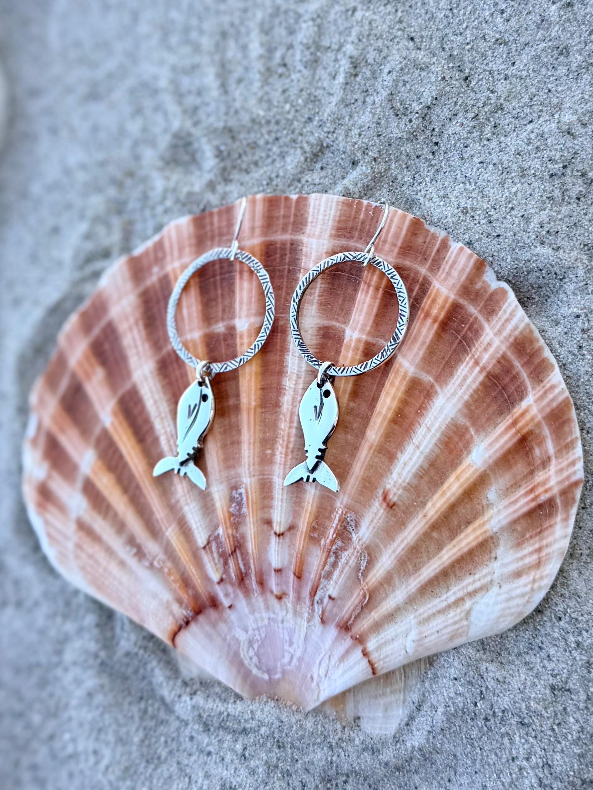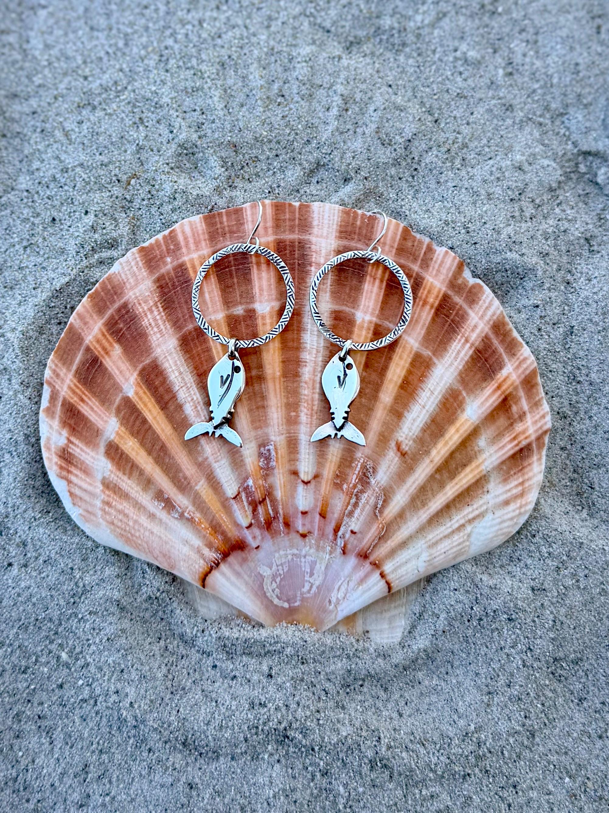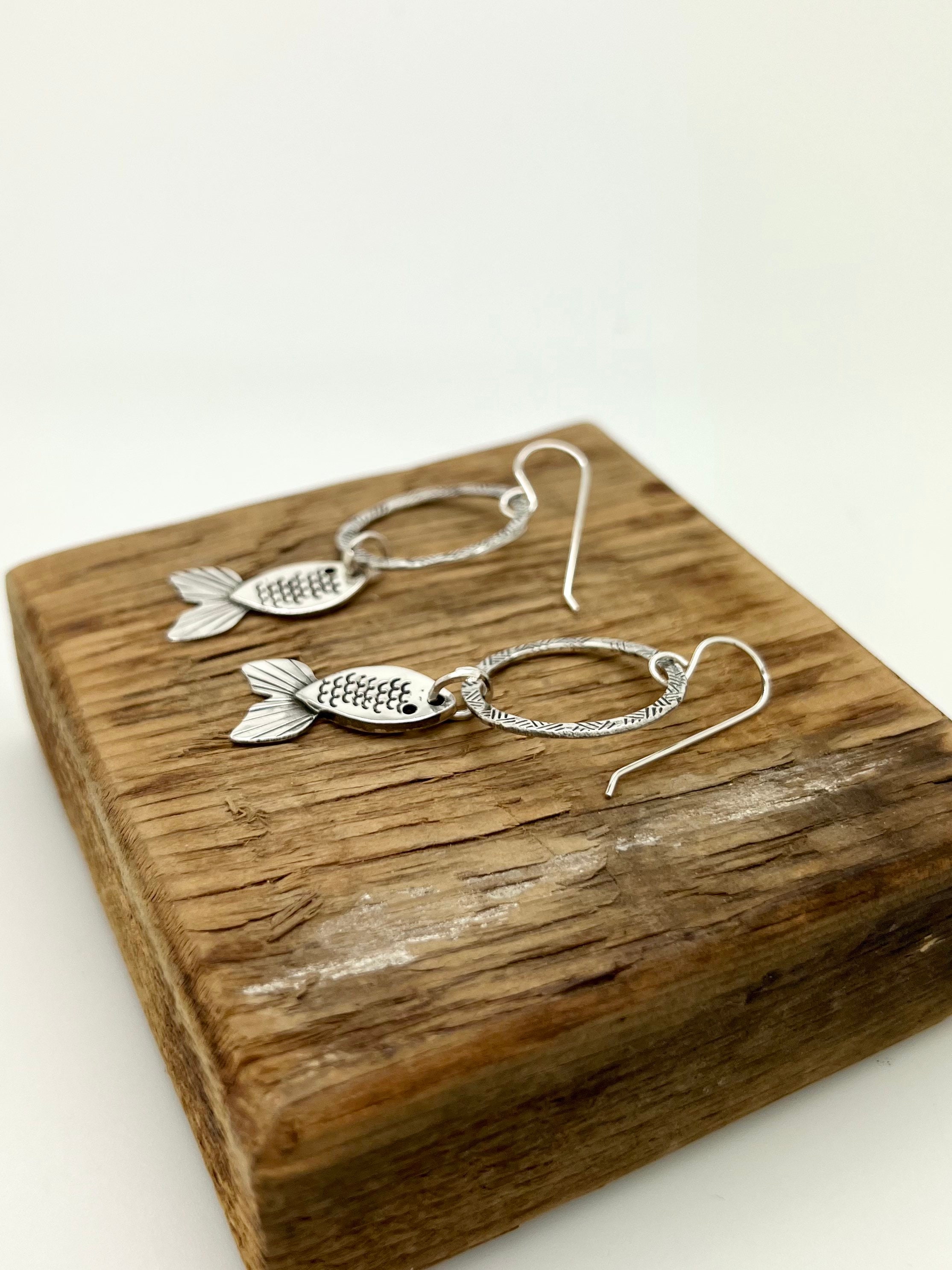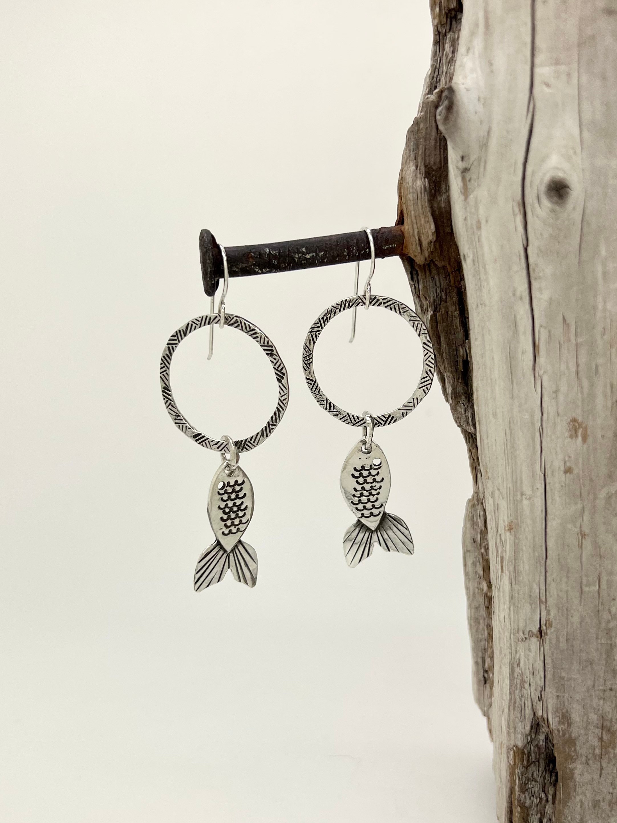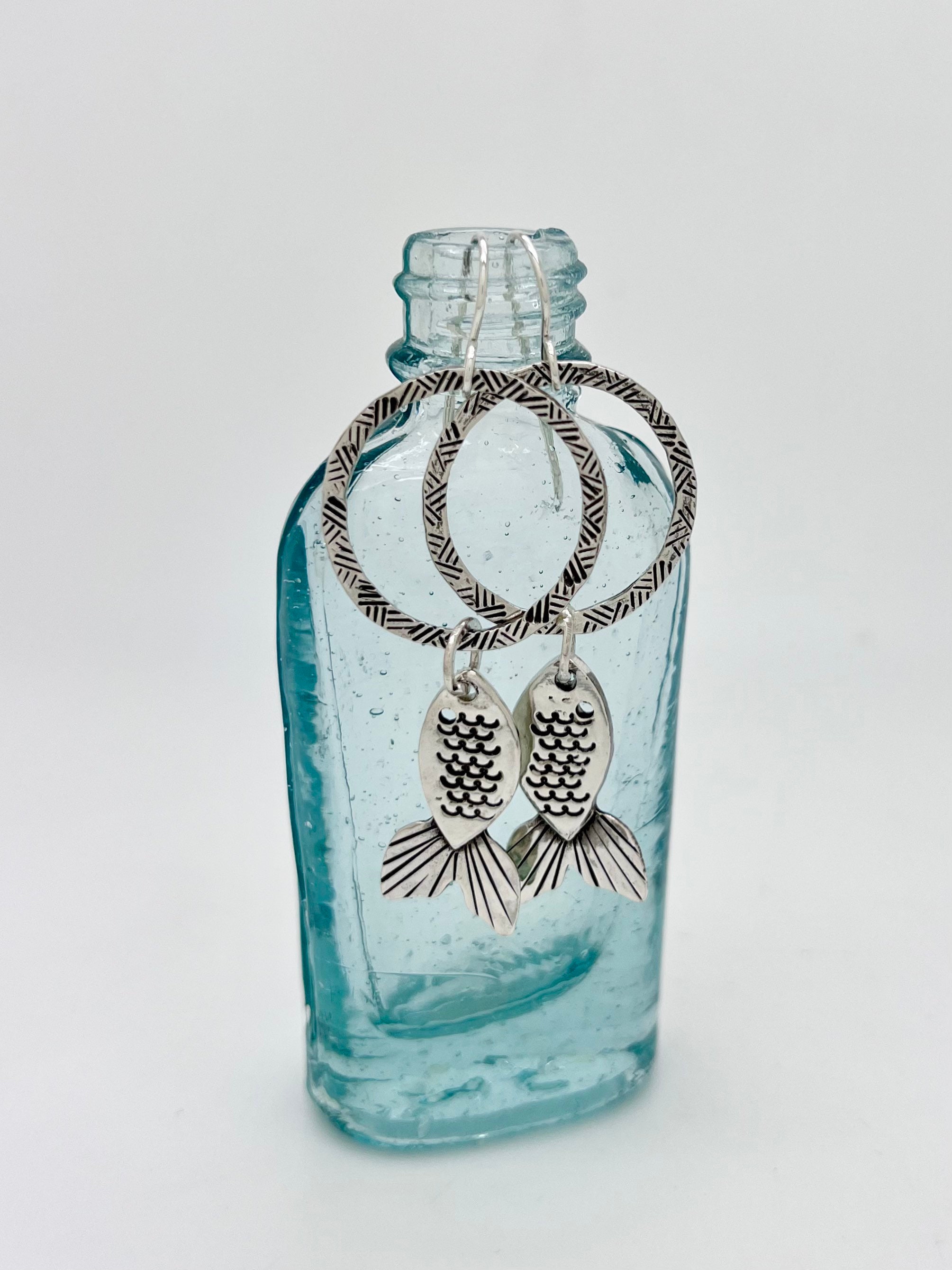 These are beautiful Hand crafted,Sterling Silver Hoop Earrings with a handmade fish drop charm. The charms were made from Vintage sterling silver spoon pieces. The fish patterns have a matching bangle bracelet available as well. https://www.notsoflatware.com/listing/662148300/fish-sterling-silver-spoon-bangle