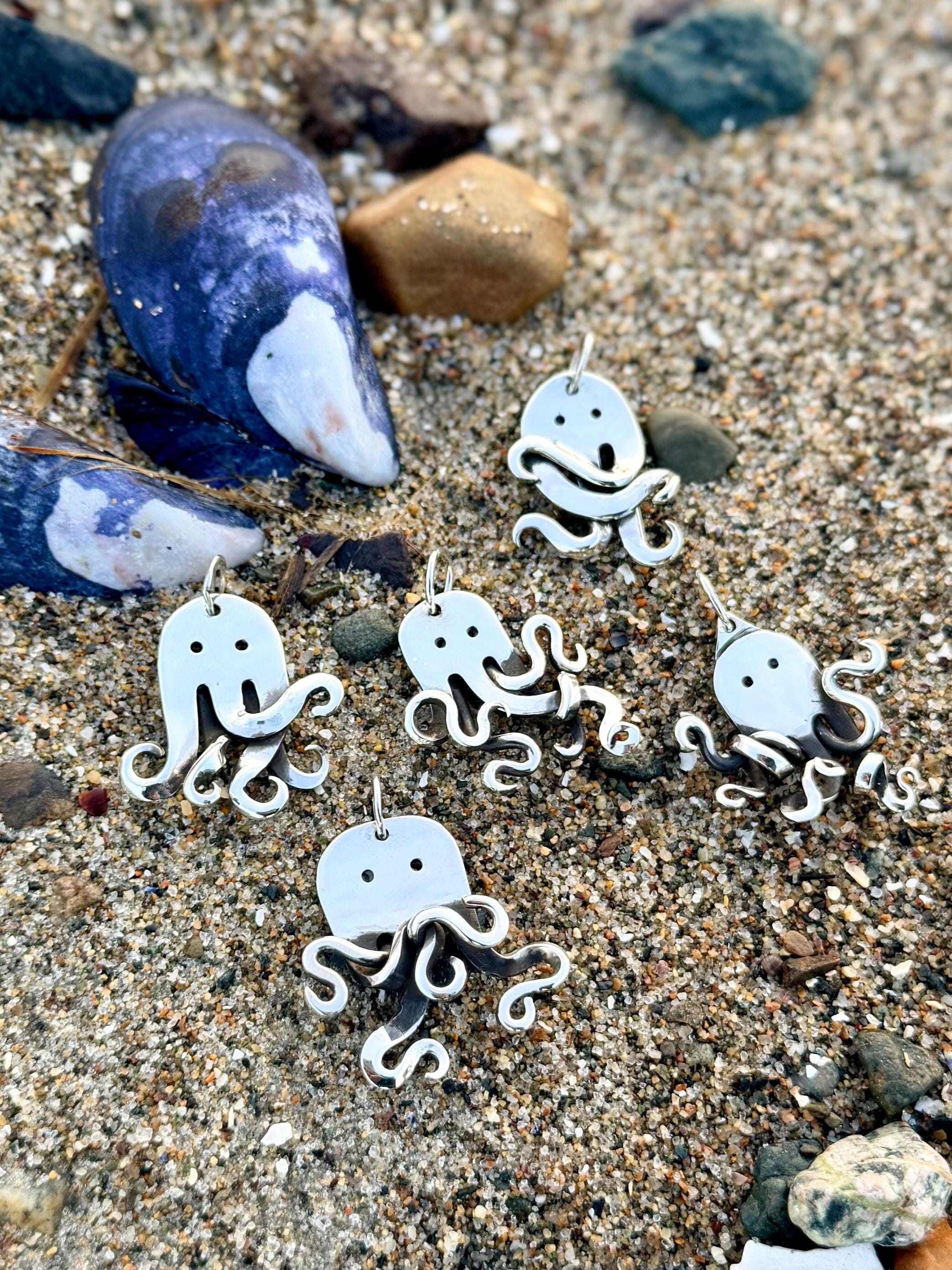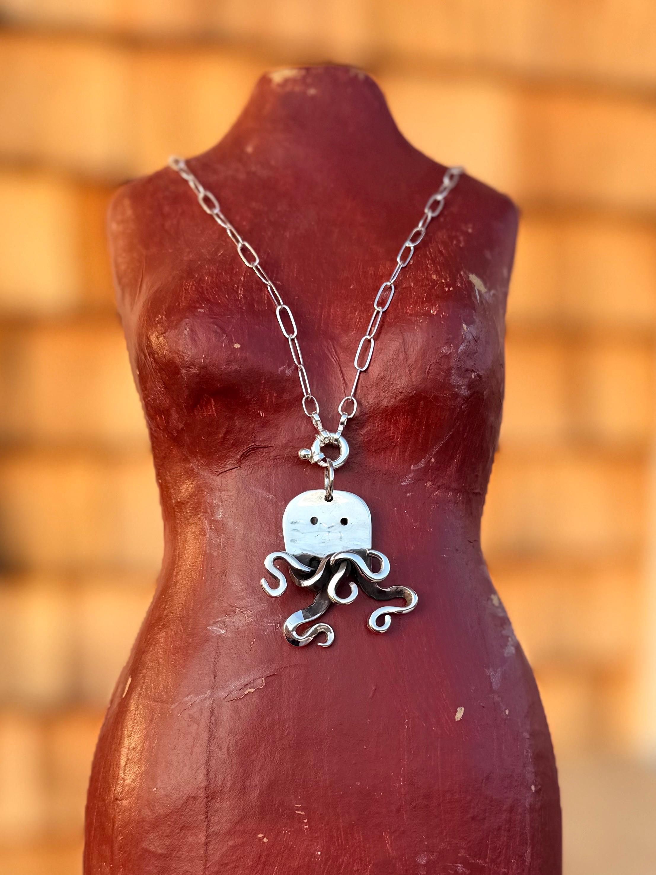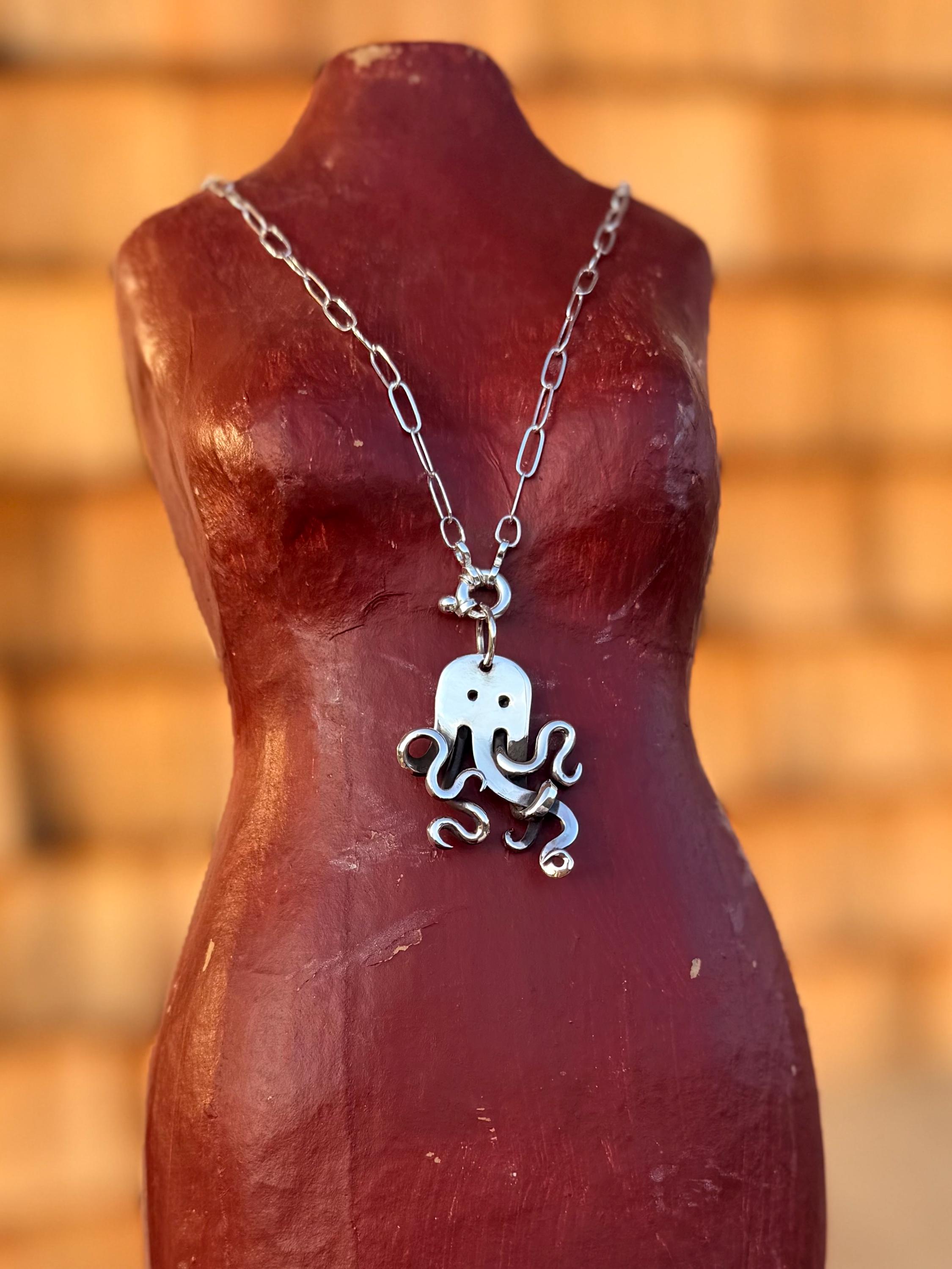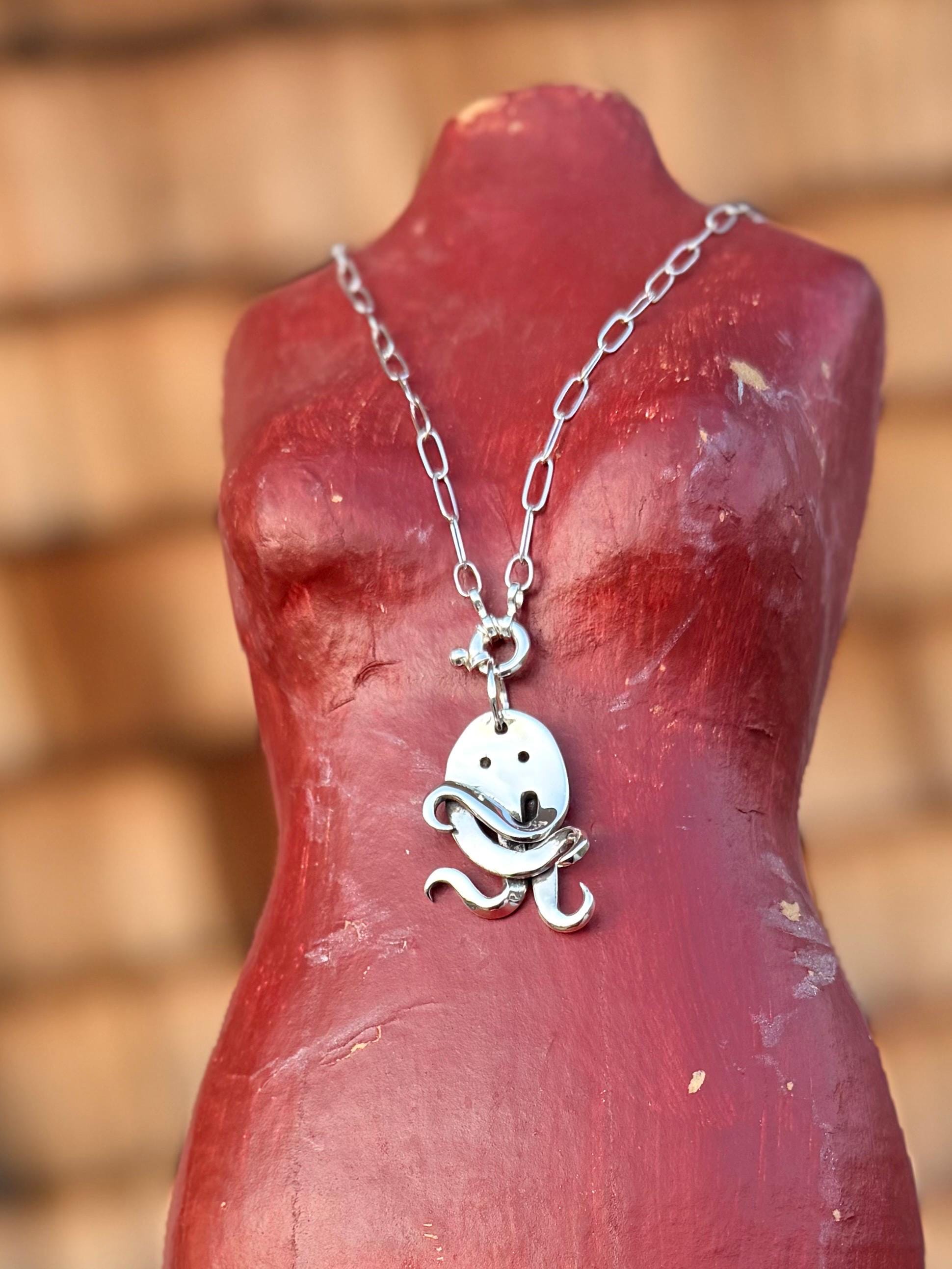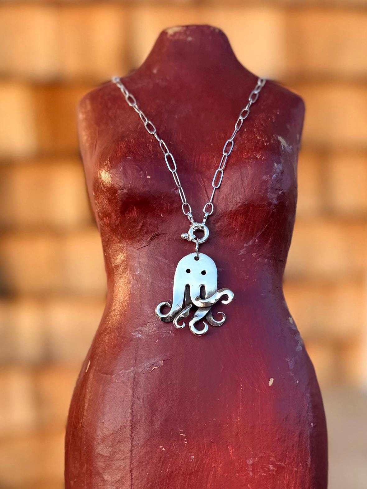 This cutie is a solid sterling silver octopus pendant hand made from sterling fork.
